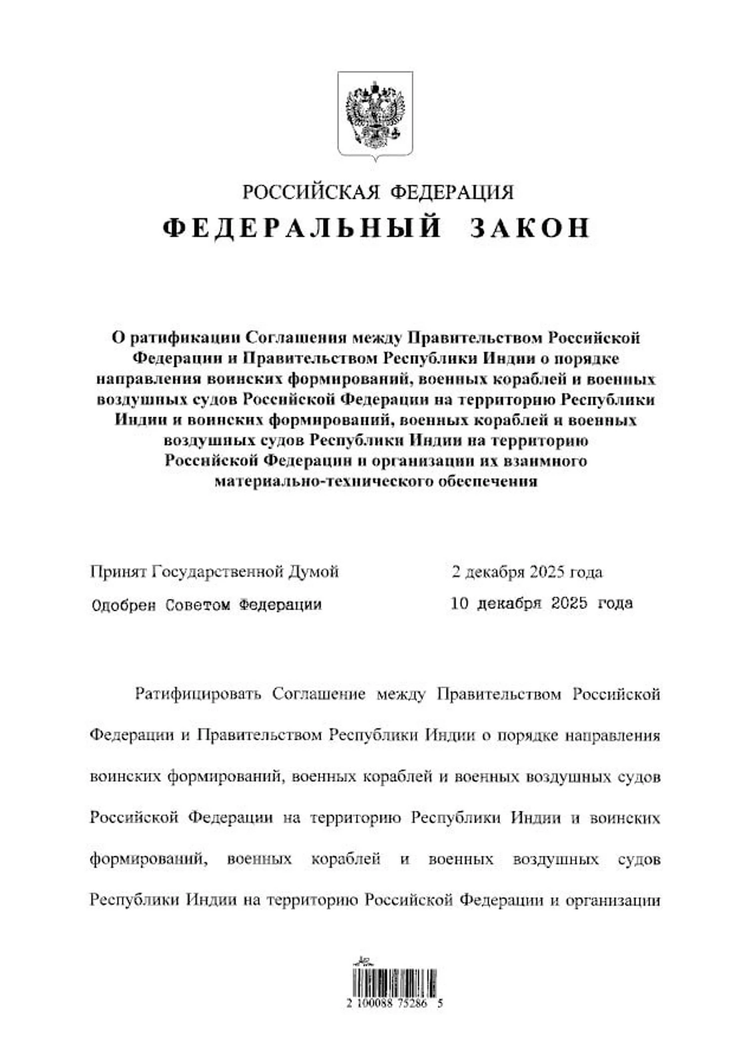 путін підписав закон про ратифікацію угоди з Індією, що регулює допуск військових формувань, кораблів та літаків однієї країни на територію іншої. Ця угода створює правову основу для взаємної присутності військових сил, що застосовується для спільних навчань та обміну досвідом.