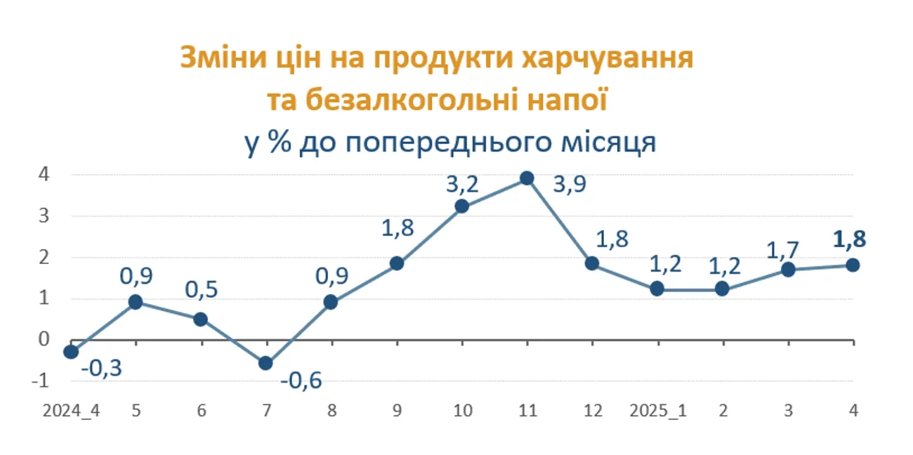 На споживчому ринку у квітні ціни на продукти харчування та безалкогольні напої зросли на 1,8%, на 19,8% у річному вимірі.