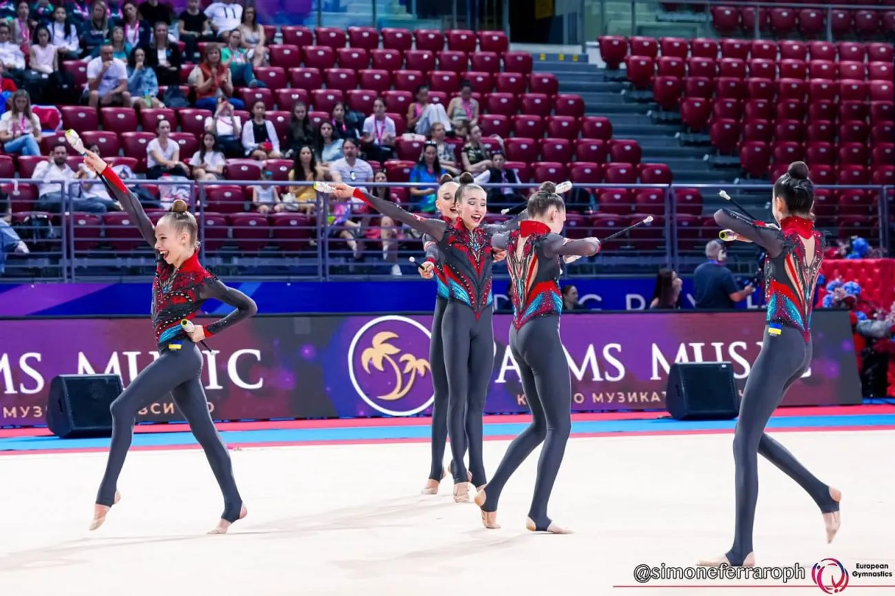 Українські спортсменки, представниці юніорської збірної України, стали першими у фіналі змагань в Софії, у групових вправах з булавами. Вони набрали 24,900 балів.
