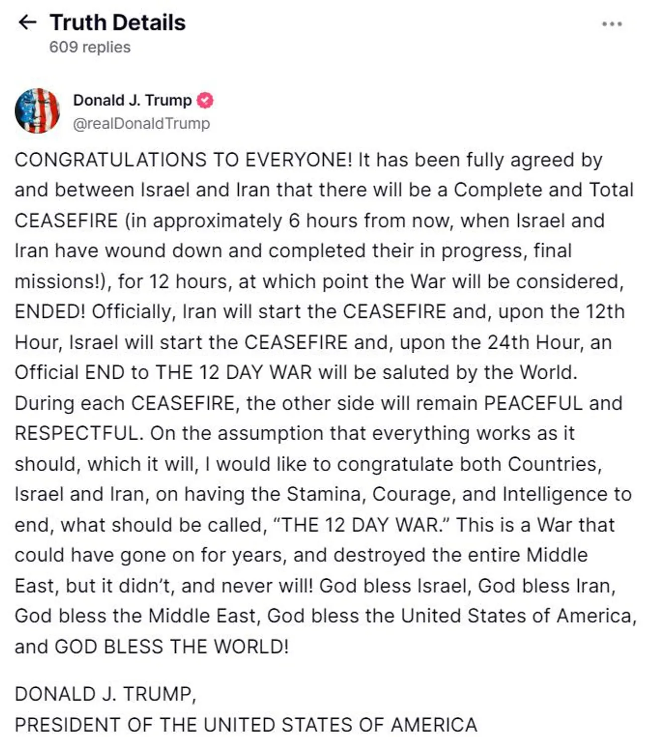 "Якщо припустити, що все працюватиме, а так і буде, я хотів би привітати обидві країни, Ізраїль та Іран, з витривалістю, мужністю та розумом для завершення того, що має бути названо "12-денною війною". Ця війна могла б тривати роками і знищити весь Близький Схід, але цього не сталося і ніколи не станеться!" - додав президент США.