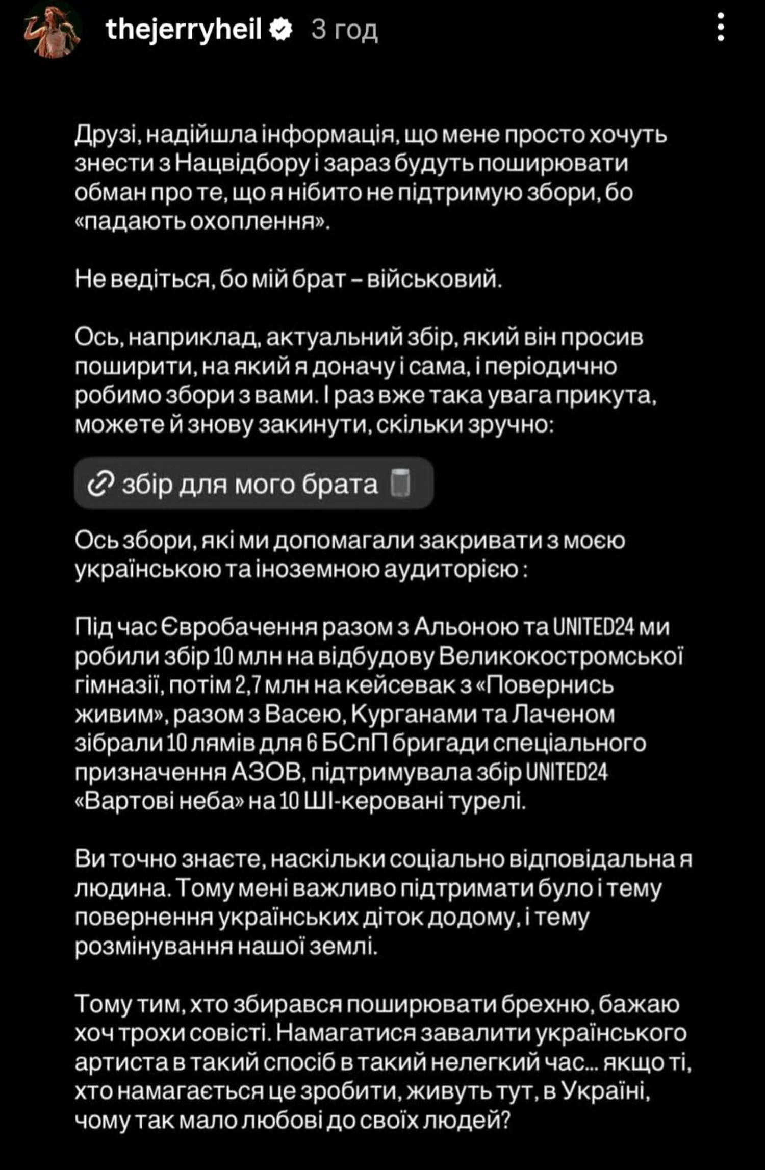 "Надійшла інформація, що мене просто хочуть знести з нацвідбору і зараз будуть поширювати обман про те, що я нібито не підтримую збори, бо "падають охоплення". Не ведіться, бо мій брат - військовий. Ось, наприклад, актуальний збір, який він просив поширити, на який я доначу і сама, і періодично робимо збори з вами", – заявила співачка.