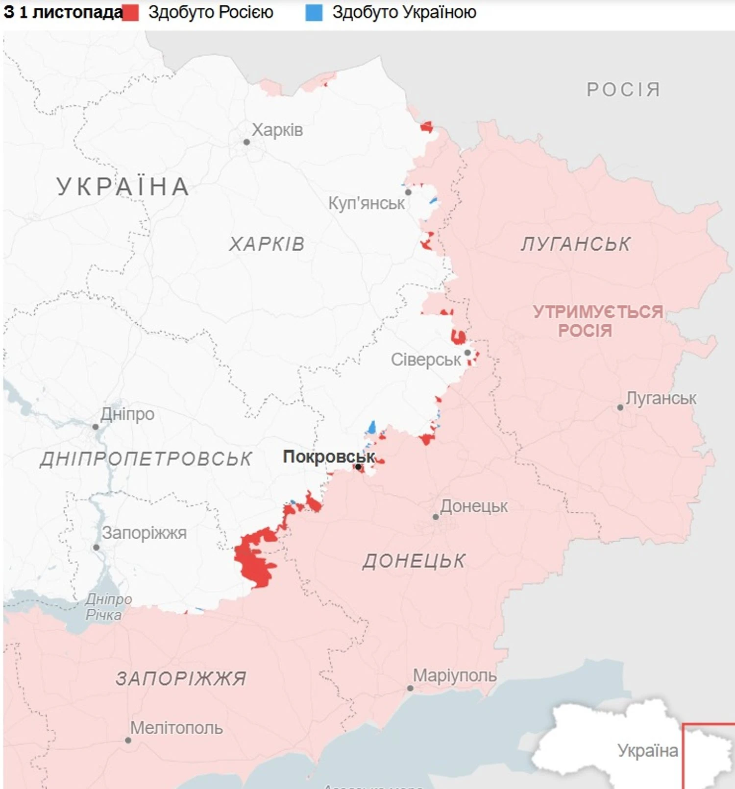 За даними української групи DeepState, у листопаді російські війська захопили 505 квадратних кілометрів території, що значно більше порівняно з 267 квадратними кілометрами у жовтні.