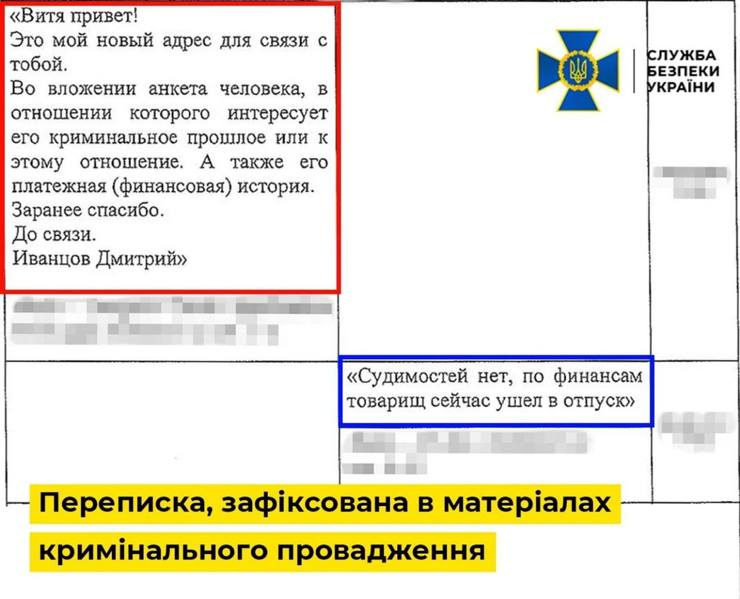 Зазначається, що надавати Іванцову потрібну інформацію він продовжив і після 2014 року, коли поплічник Януковича відкрито перейшов на бік ворога. Це підтверджується, зокрема, законспірованим листуванням, яке фігуранти відновили буквально через три дні після фейкового референдуму про "приєднання" Криму до рф.