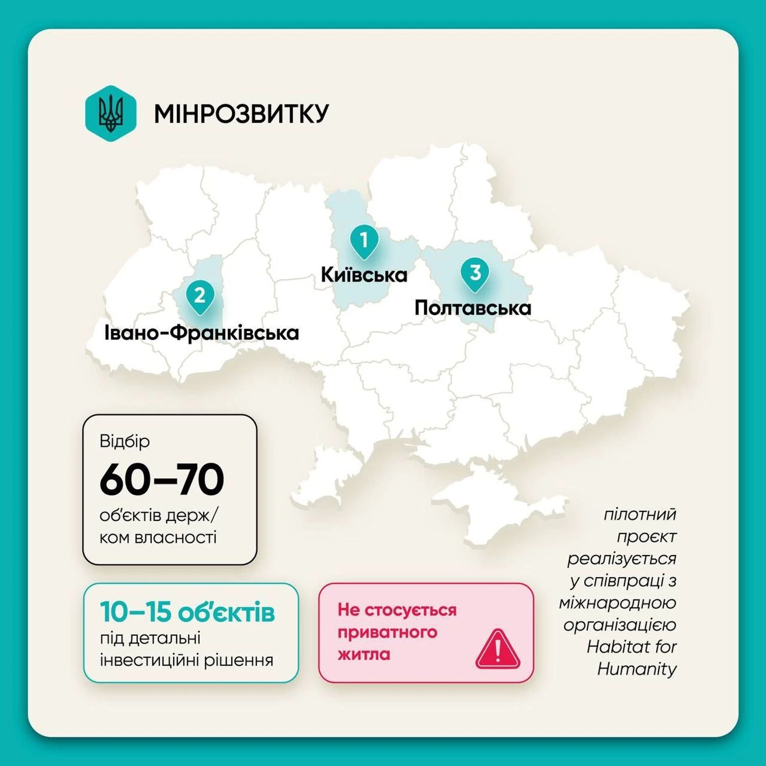 Олексій Кулеба пояснив, що під житло для ВПО переобладнають лише порожні державні та комунальні будівлі, не чіпаючи приватну власність. Пілотний етап програми стартує в Київській, Івано-Франківській та Полтавській областях.