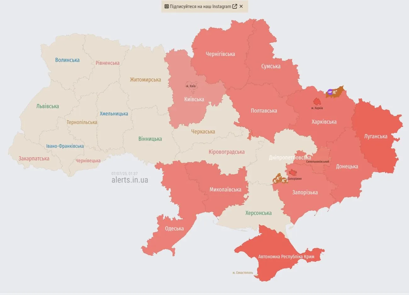 У ніч проти понеділка, 7 липня у Києві та низці областей України оголошено повітряну тривогу через загрозу ударних БпЛА. Про це інформує УНН з посиланням на Київську міську державну адміністрацію (КМДА), Повітряні Сили Збройних Сил України (ЗСУ)