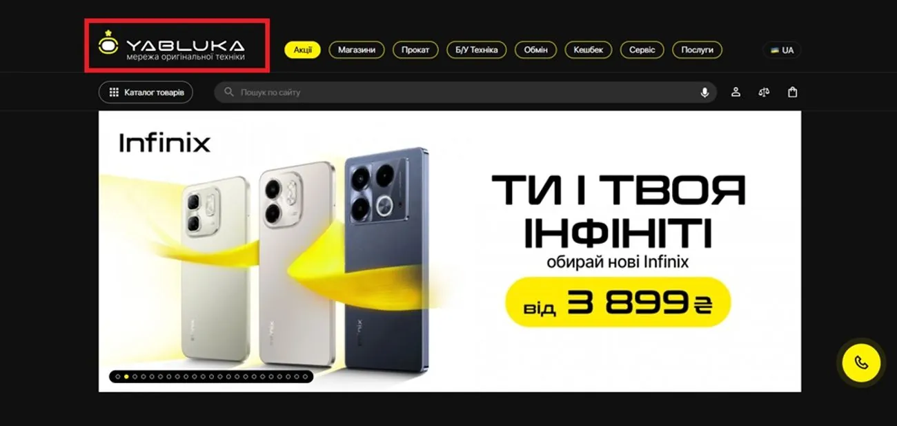 Лінгвістичні прийоми ілюструє приклад стартової сторінки мережі YABLUKA, яку прикрашає банер із написом "мережа оригінальної техніки". Формулювання звучить авторитетно й створює враження, що компанія є офіційним партнером виробника. Однак юридично поняття "оригінальний" не дорівнює "офіційний": це лише вказівка на справжнє походження товару, а не на ліцензійний канал постачання чи наявність сертифікованого сервісу.