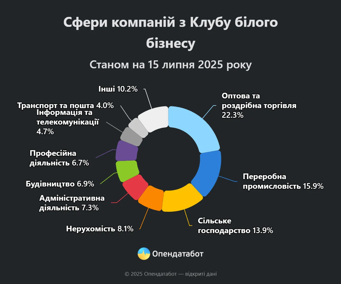 Найбільше представників Клубу — у сфері торгівлі. З них 22% компаній займаються оптовою або роздрібною торгівлею чи ремонтом автотранспорту. На другому місці — переробна промисловість (16%), третє — за сільським, лісовим і рибним господарством (14%). Далі йдуть нерухомість (8%) і адміністративне обслуговування (7%).