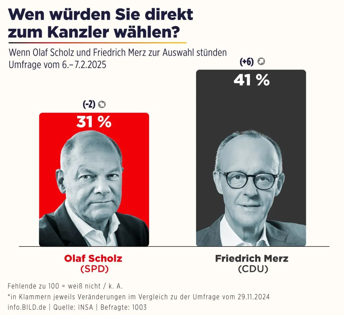 За даними опитування INSA, Фрідріх Мерц міг би отримати 24% голосів на посаду канцлера, тоді як Олаф Шольц - 16%. Мерц лідирує в оцінках компетентності з більшості політичних питань.