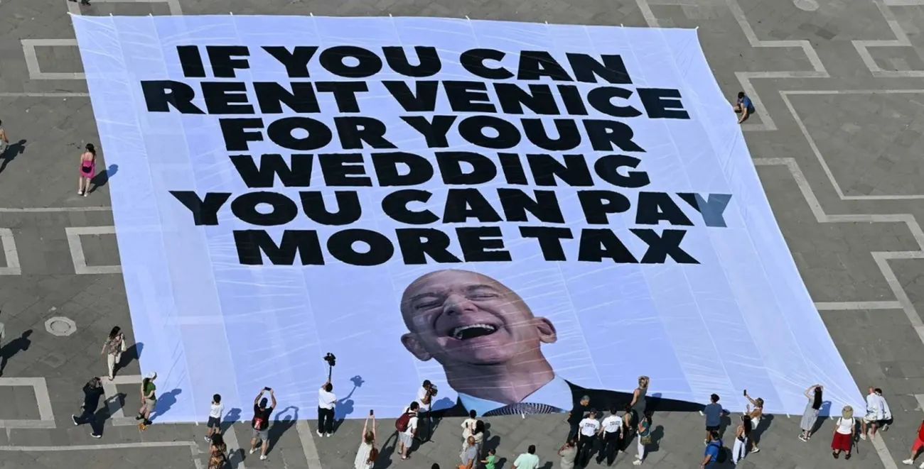 Зазначимо, що у попередні дні активісти розгорнули на площі Сан-Марко у Венеції гігантську фотографію Безоса з підписом: "Якщо ви можете орендувати Венецію для свого весілля, ви можете сплатити більше податків".