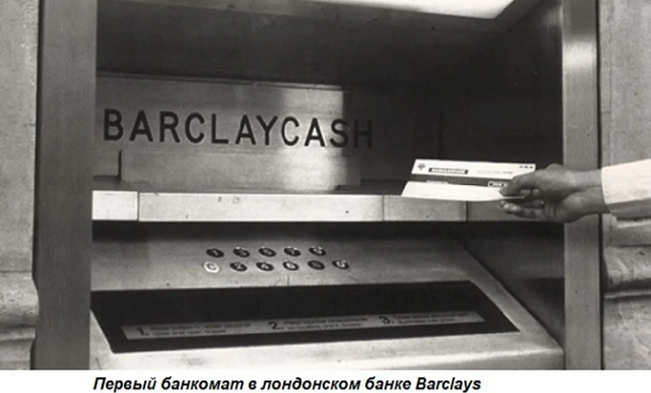 Перший банкомат винайшов Джон Шеперд-Беррон, який працював управителем компанії "Де Ла Рю". Він прагнув створити такий пристрій, за допомогою якого можна отримувати готівку в будь-якій точці світу. На таке рішення його надихнув автоматичний кіоск, в якому він брав шоколадні батончики. Винахідник зрозумів, що замість цукерок у машину можливо помістити гроші.