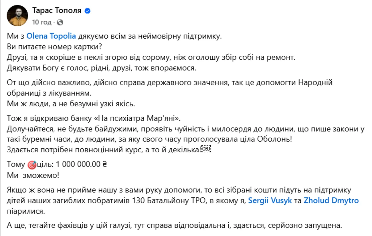 Тополя разом з дружиною подякував всім небайдужим. Разом з тим, він написав, що оголошує збір у мільйон гривень на психіатричне лікування для Безуглої.
