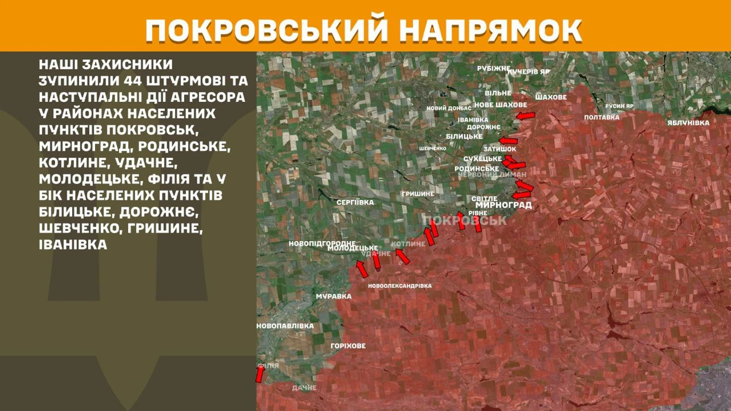 На Покровському напрямку наші захисники зупинили 44 штурмові та наступальні дії агресора у районах населених пунктів Покровськ, Мирноград, Родинське, Котлине, Удачне, Молодецьке, Філія та у бік населених пунктів Білицьке, Дорожнє, Шевченко, Гришине, Іванівка.