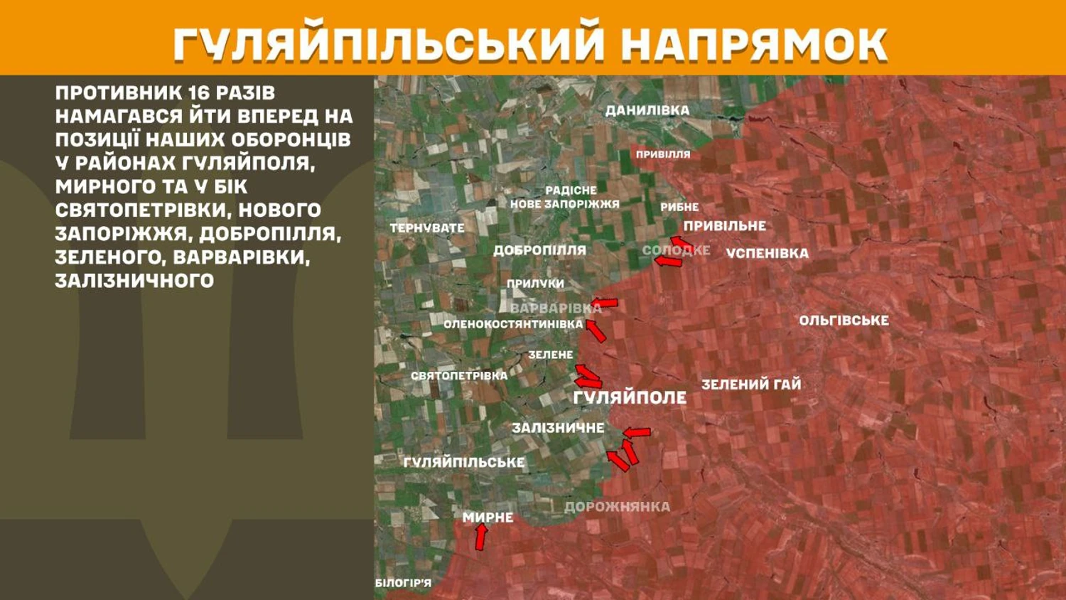 На Гуляйпільському напрямку противник 16 разів намагався йти вперед на позиції наших оборонців у районах Гуляйполя, Мирного та у бік Святопетрівки, Нового Запоріжжя, Добропілля, Зеленого, Варварівки, Залізничного.