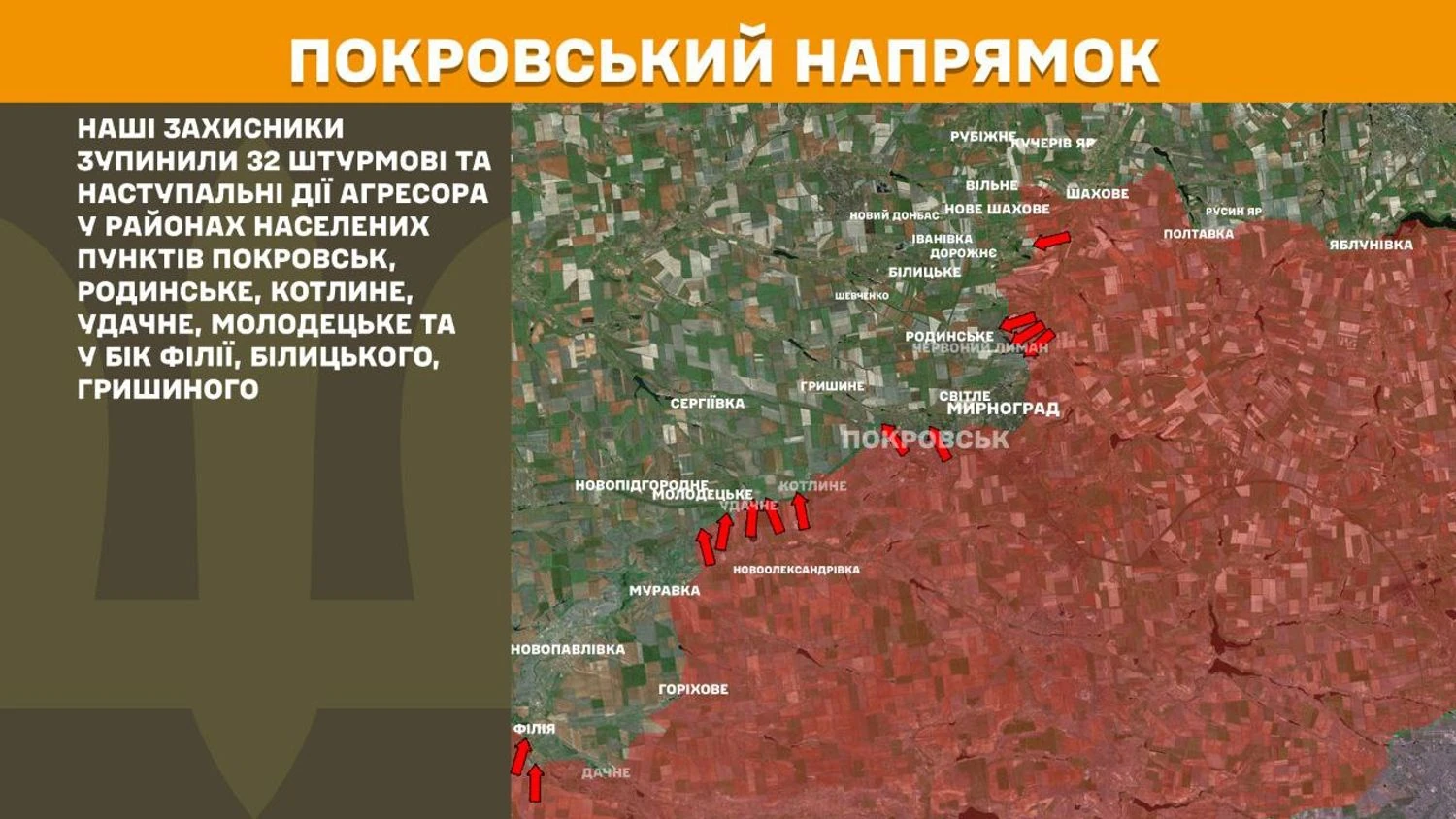 На Покровському напрямку українські захисники зупинили 32 штурмові та наступальні дії агресора у районах населених пунктів Покровськ, Родинське, Котлине, Удачне, Молодецьке та у бік Філії, Білицького, Гришиного.