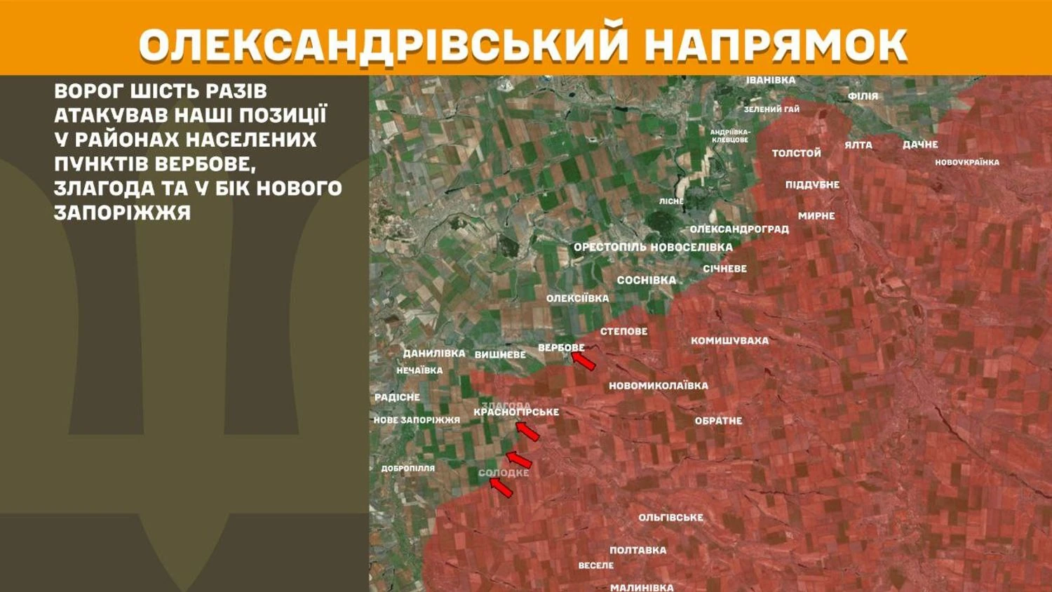 На Олександрівському напрямку ворог шість разів атакував українські позиції у районах населених пунктів Вербове, Злагода та у бік Нового Запоріжжя.
