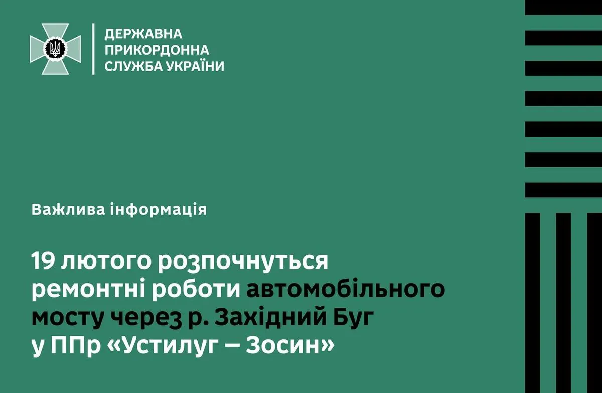 На пункті пропуску "Устилуг – Зосин" з 19 лютого розпочнеться ремонт мосту через річку Західний Буг. Роботи триватимуть до січня 2026 року, очікуються затримки руху в обох напрямках.