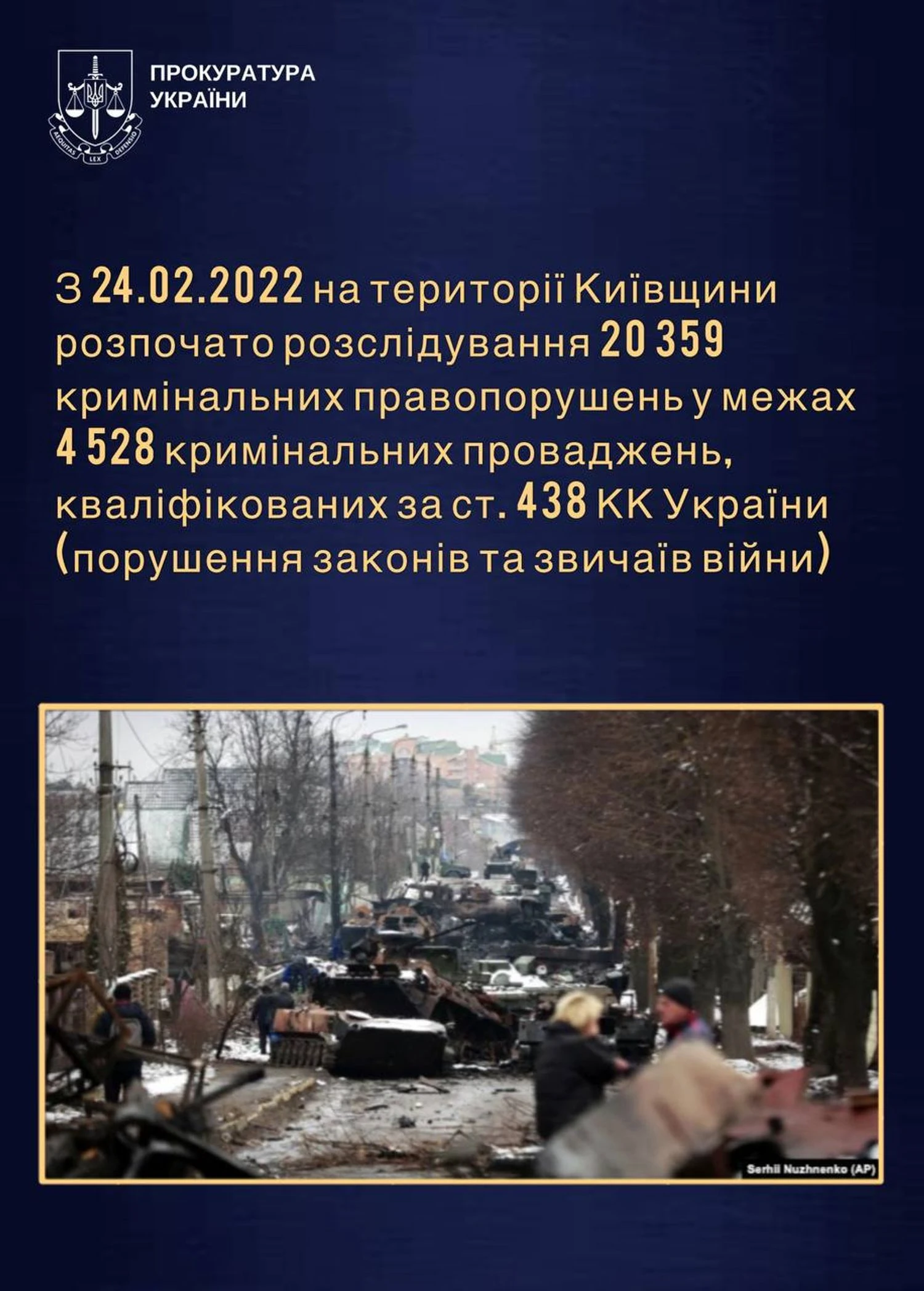 На Київщині розслідується 20 359 кримінальних правопорушень за ст. 438 ККУ (порушення законів та звичаїв війни). 152 окупантам повідомлено про підозру, 22 засуджено.