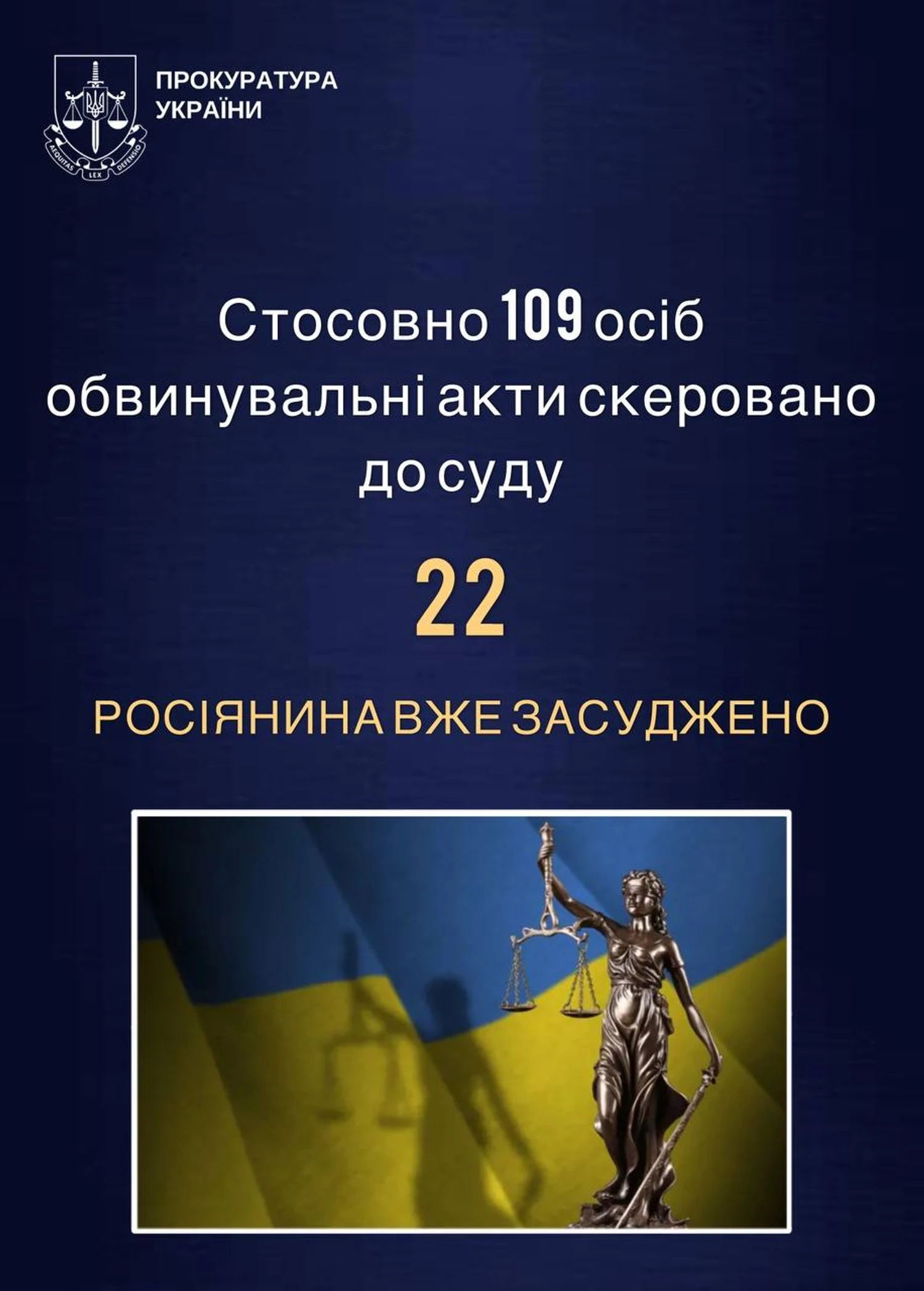 За результатами розслідування 152 російським окупантам повідомили про підозру в скоєнні воєнних злочинів в Київській області. Стосовно 109 окупантів обвинувальні акти скеровано до суду. 22 російських окупантів вже засуджено до різних термінів позбавлення волі.