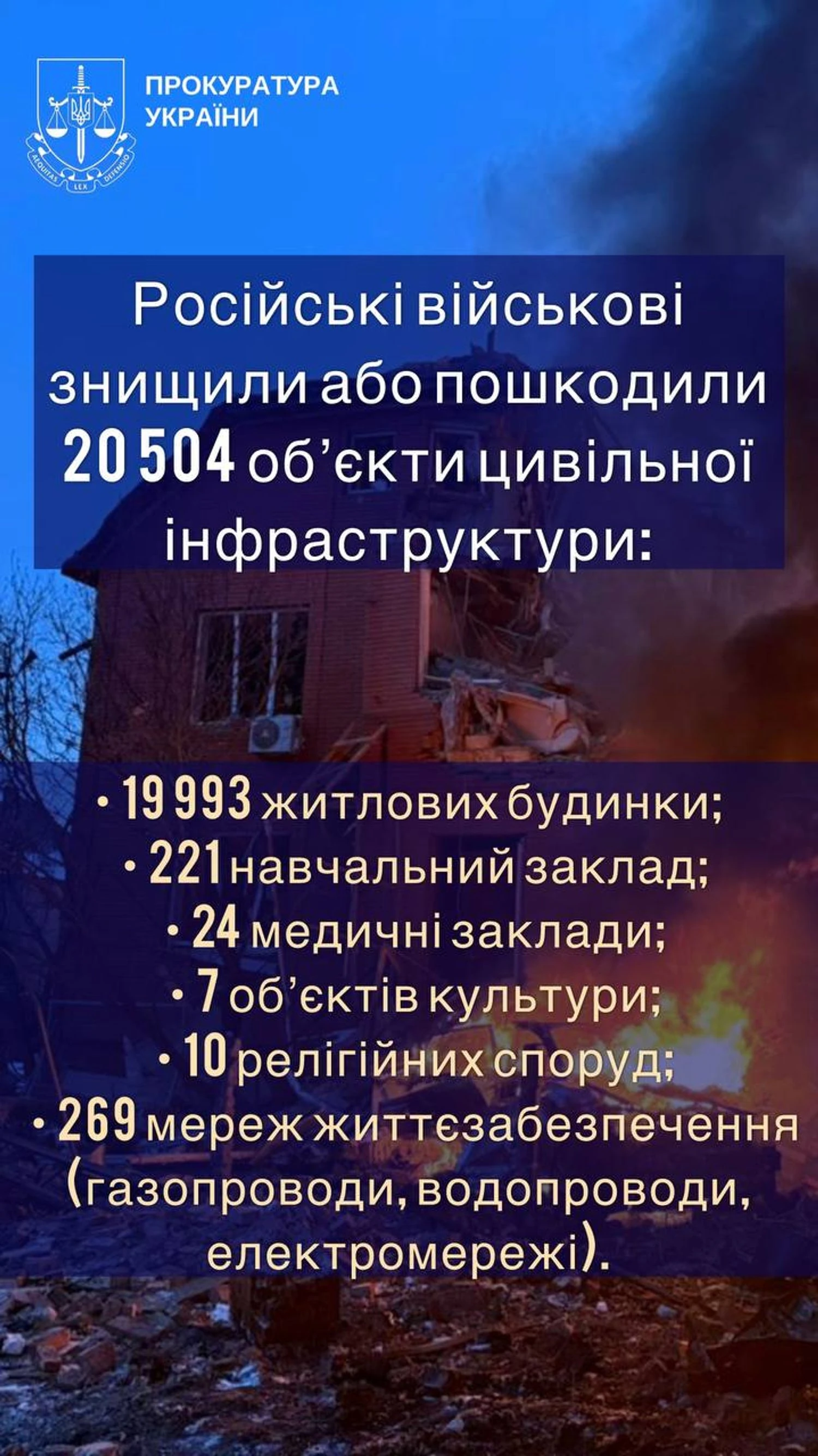 Також російські війська знищили або пошкодили 20 504 об’єкти цивільної інфраструктури на Київщині, серед них: