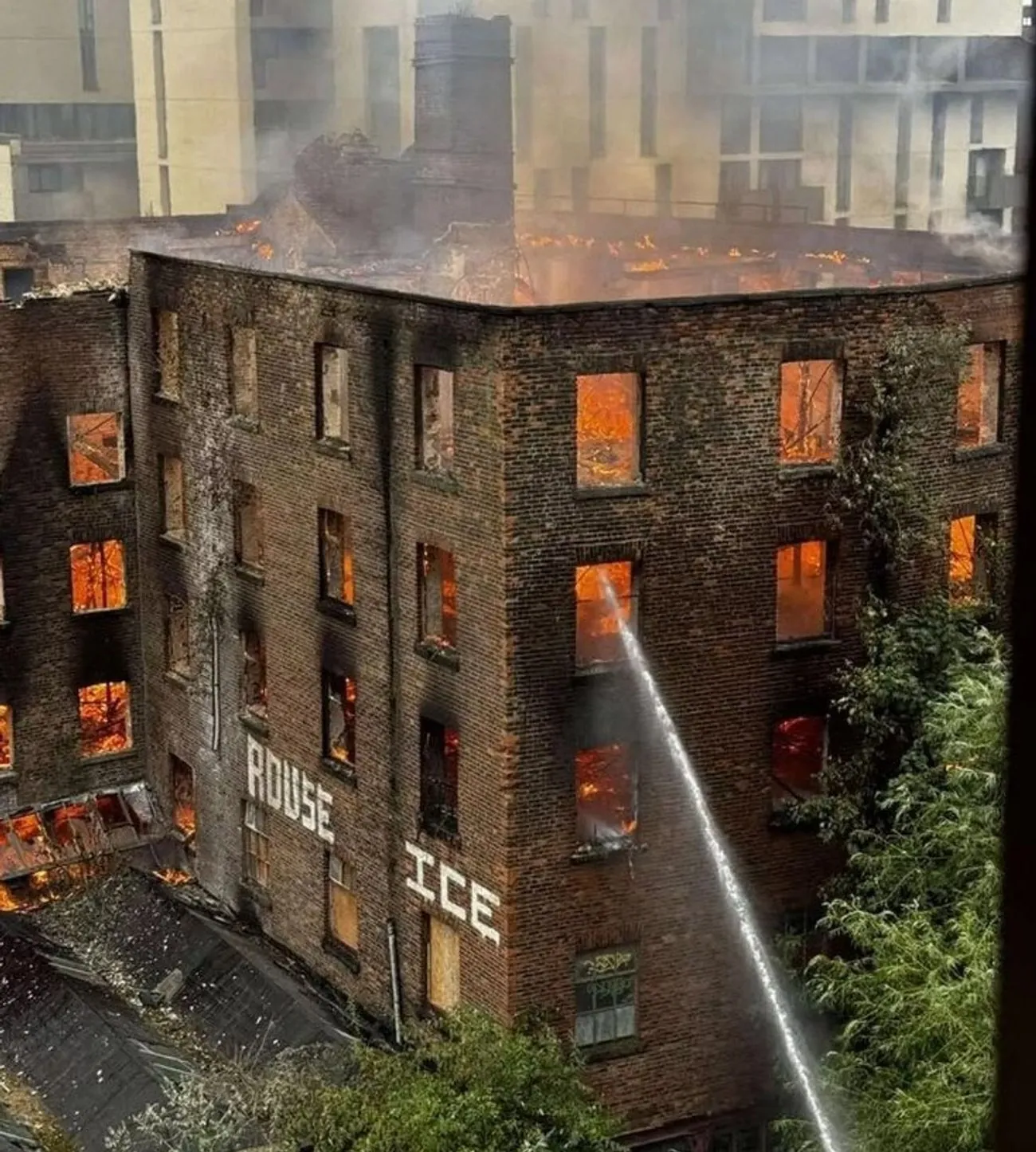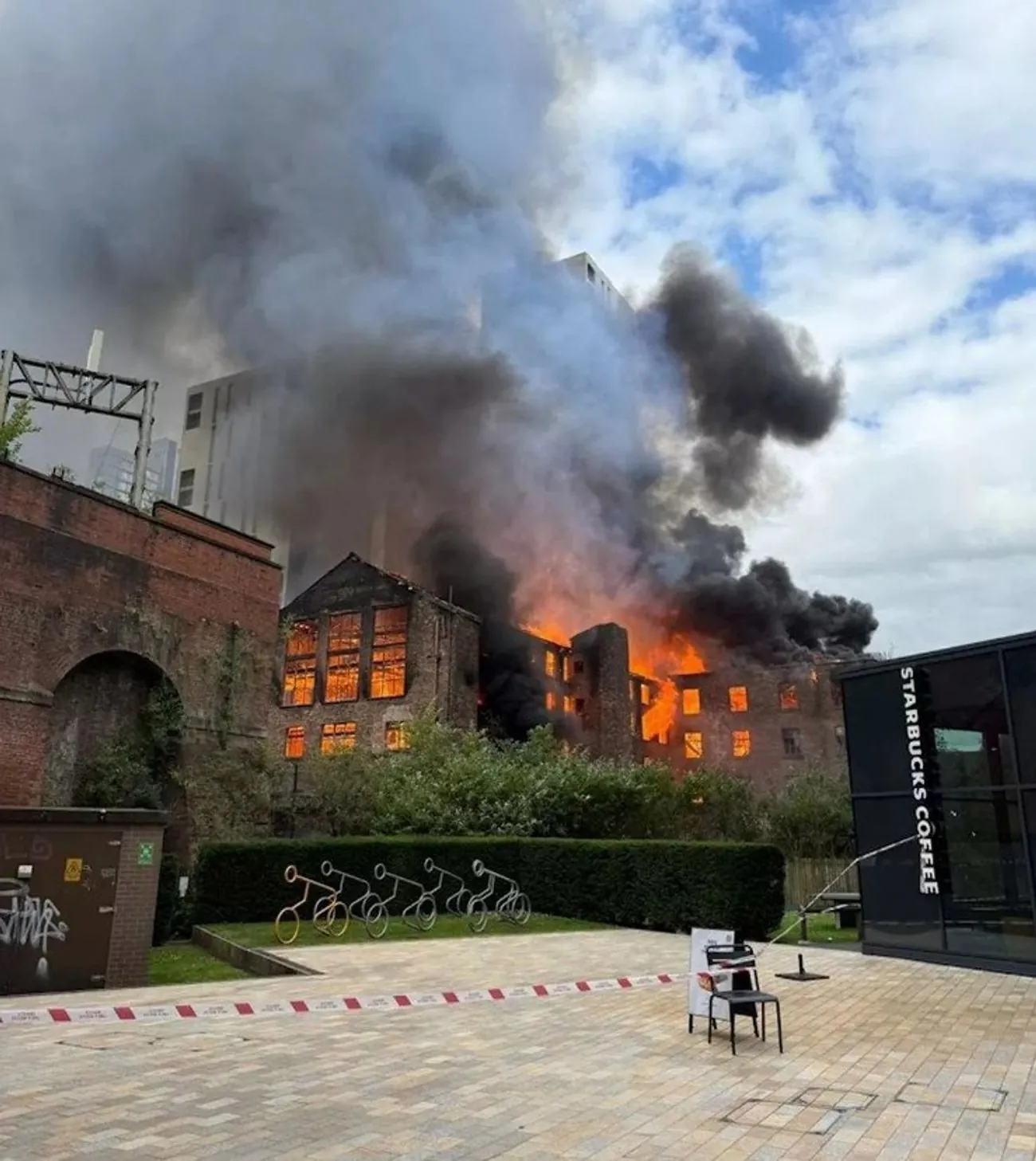 У Манчестері спалахнула потужна пожежа в історичній будівлі Медлокського млина, якій 223 роки. Вогонь охопив три поверхи, що призвело до евакуації людей та скасування поїздів.