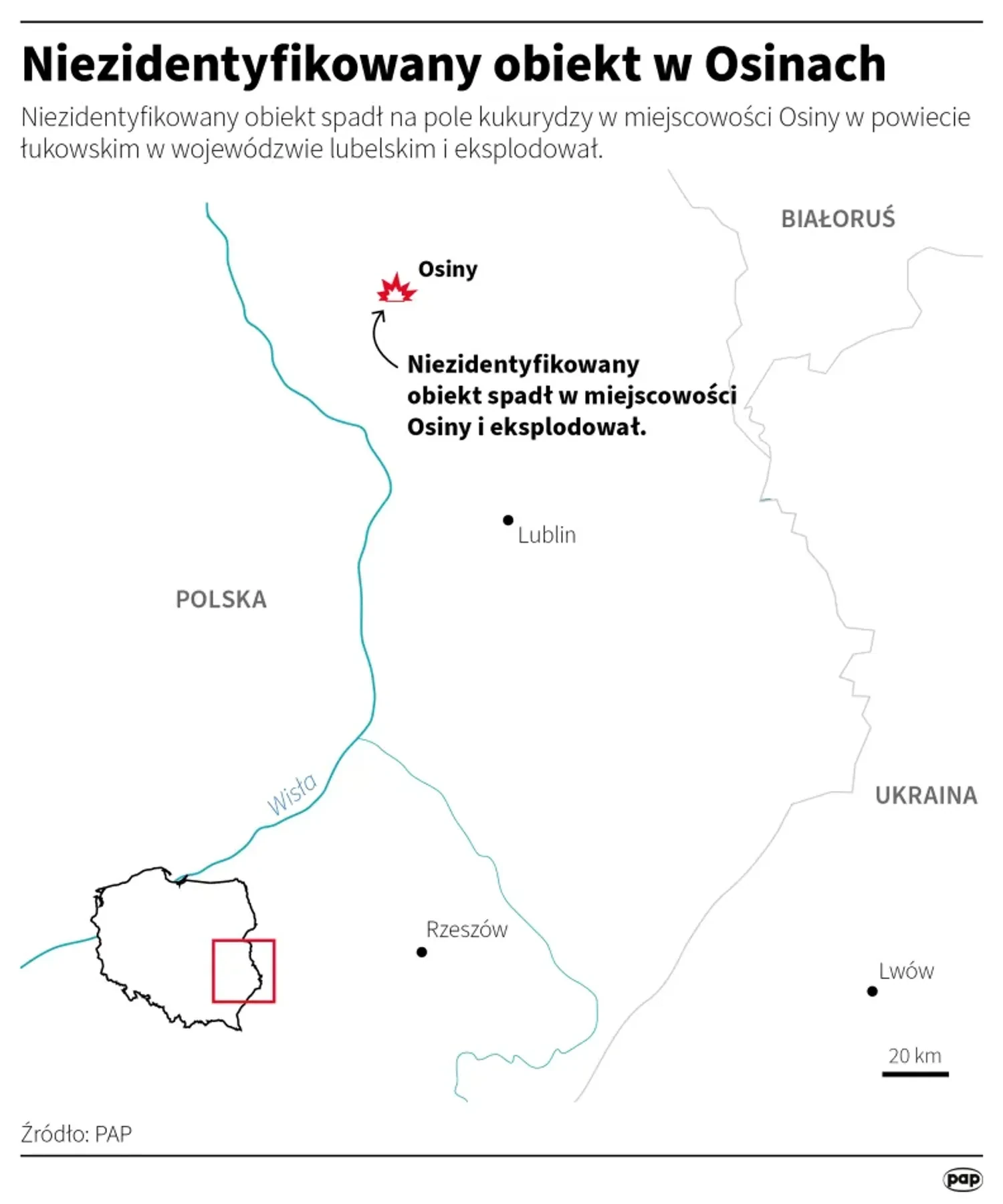 Невідомий об'єкт упав і вибухнув на кукурудзяному полі поблизу Осін у Луківському повіті Люблінського воєводства.