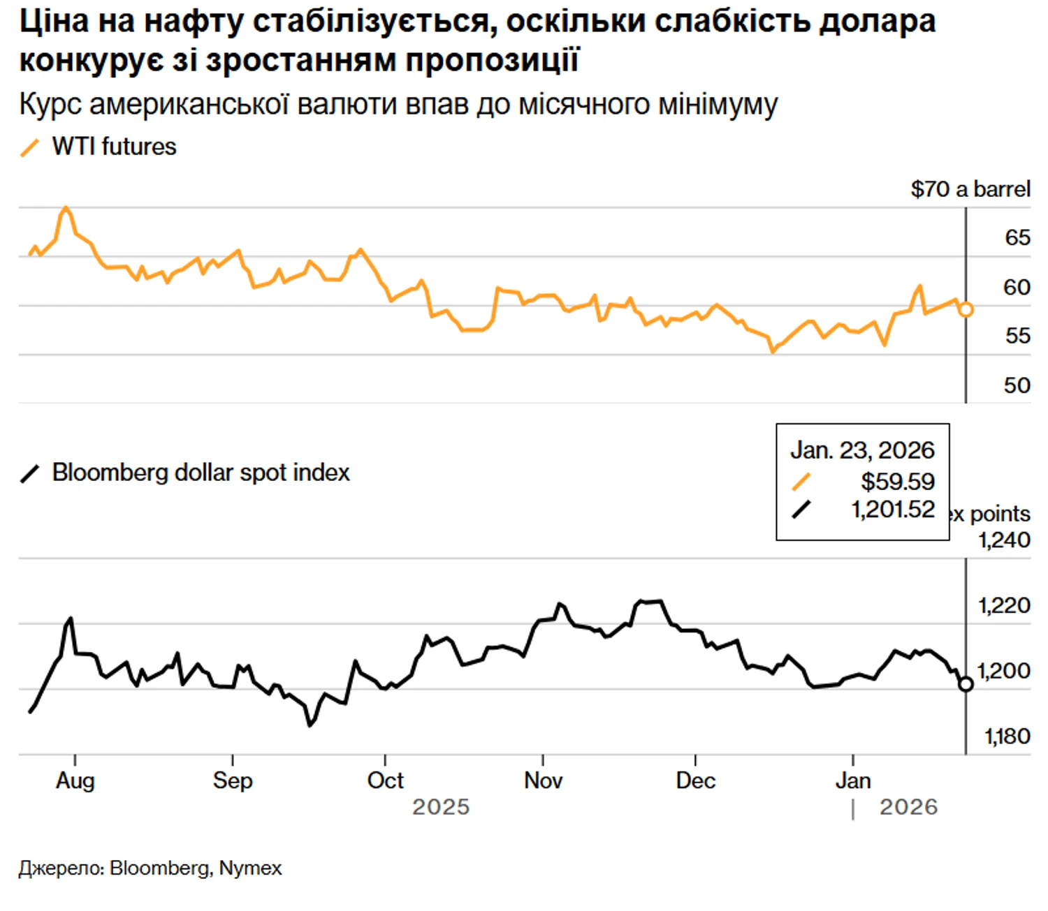 Станом на 23 січня ф'ючерси на нафту марки West Texas Intermediate (WTI) торгуються поблизу позначки $60 за барель, демонструючи тенденцію до п'ятого поспіль тижневого зростання. Brent утримується на рівні близько $64 за барель. Послаблення долара США зробило нафту привабливішою для іноземних покупців, що допомогло нівелювати негатив від збільшення запасів у американських сховищах.