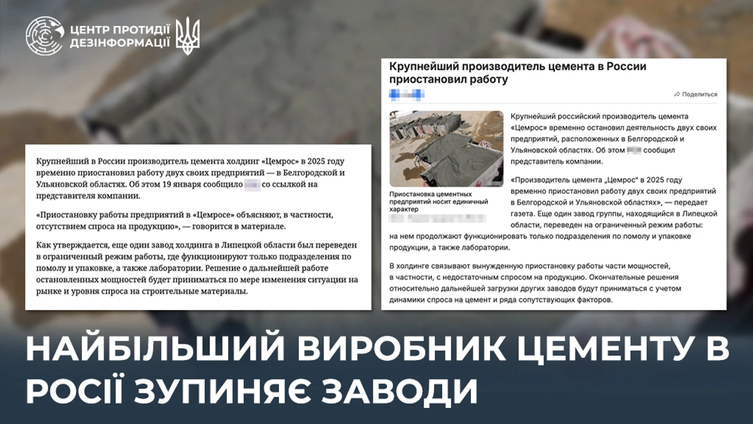 Холдинг "Цемрос", який контролює 33% російського ринку цементу, заморозив два заводи - в бєлгородській та ульяновській областях. Ще одне підприємство в липецькій області перейшло на обмежений режим – компанія перевела працівників на чотириденний робочий тиждень. Про це повідомляє Центр протидії дезінформації РНБО України (ЦПД), інформує УНН.