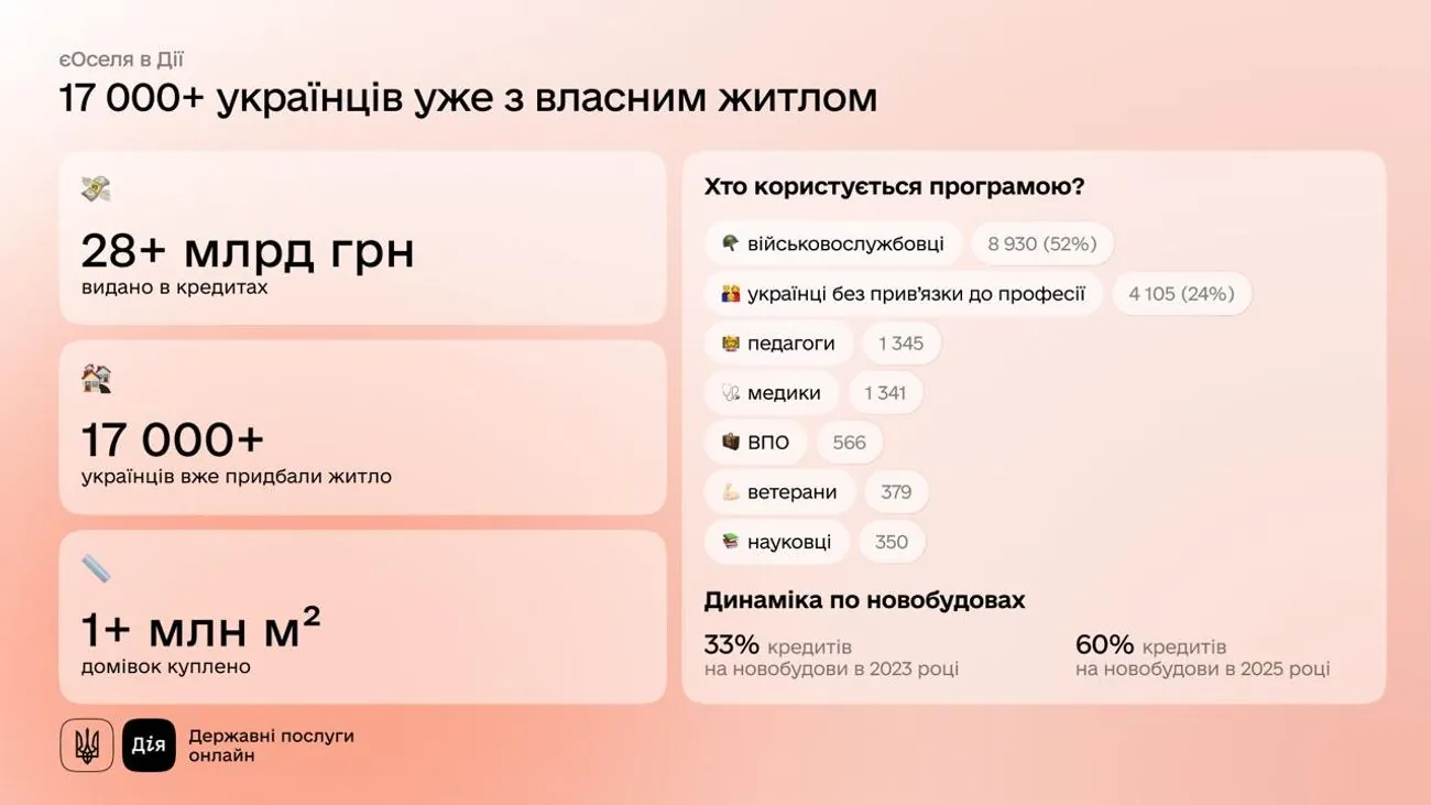 Завдяки програмі єОселя тисячі українських родин отримали власне житло на суму понад 28 млрд грн. Подати заявку можна через застосунок Дія.