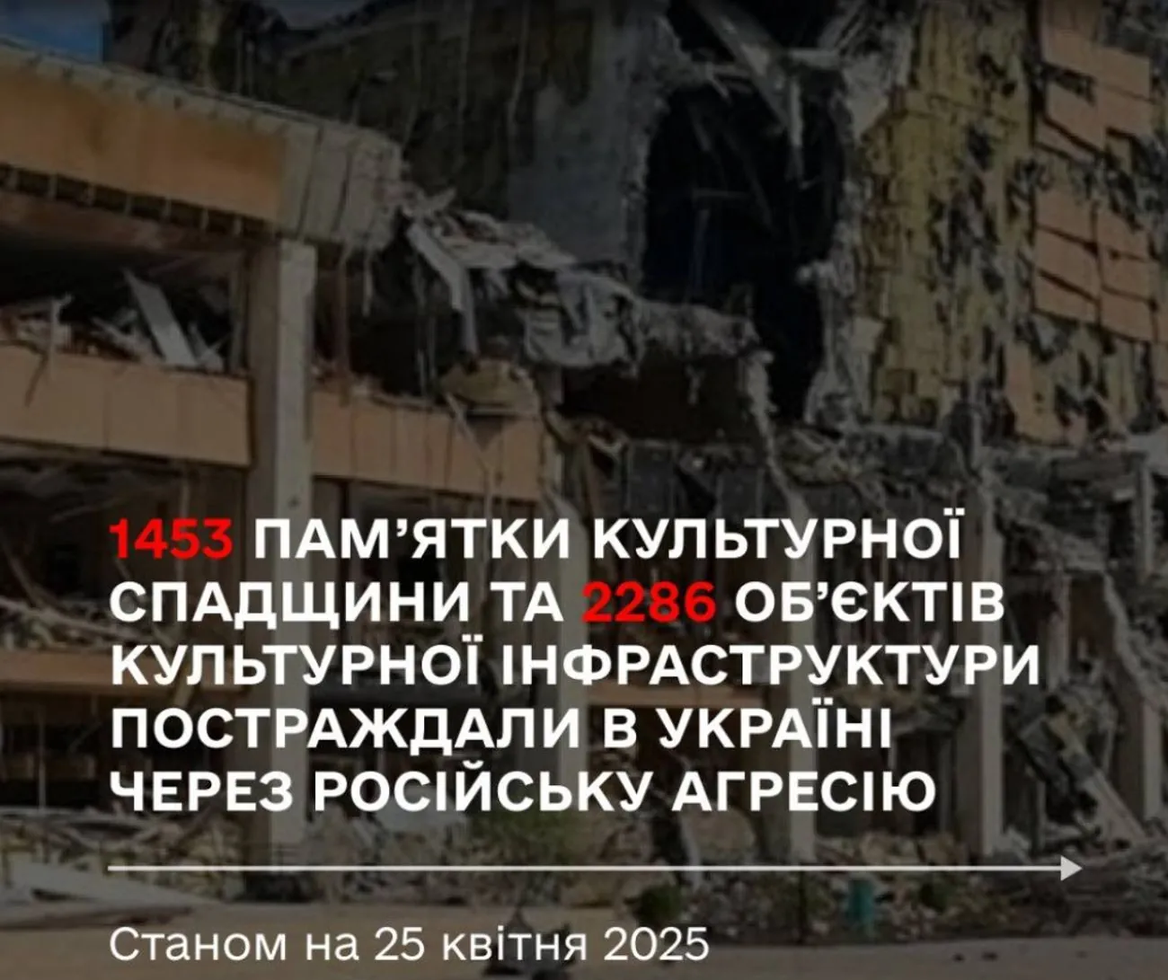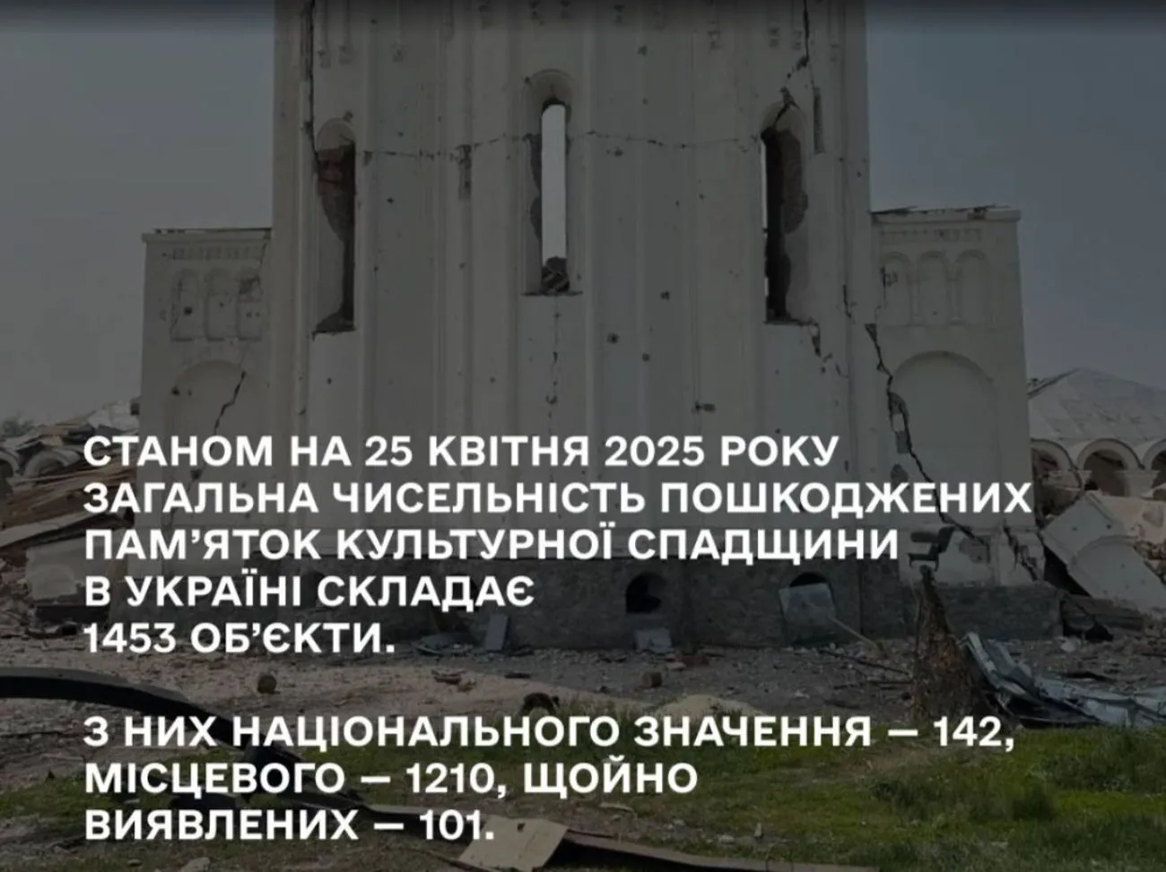 За інформацією, наданою обласними та Київською міською військовими адміністраціями, станом на 25 квітня 2025 року загальна чисельність пошкоджених пам’яток культурної спадщини в Україні складає 1453 об’єкти.