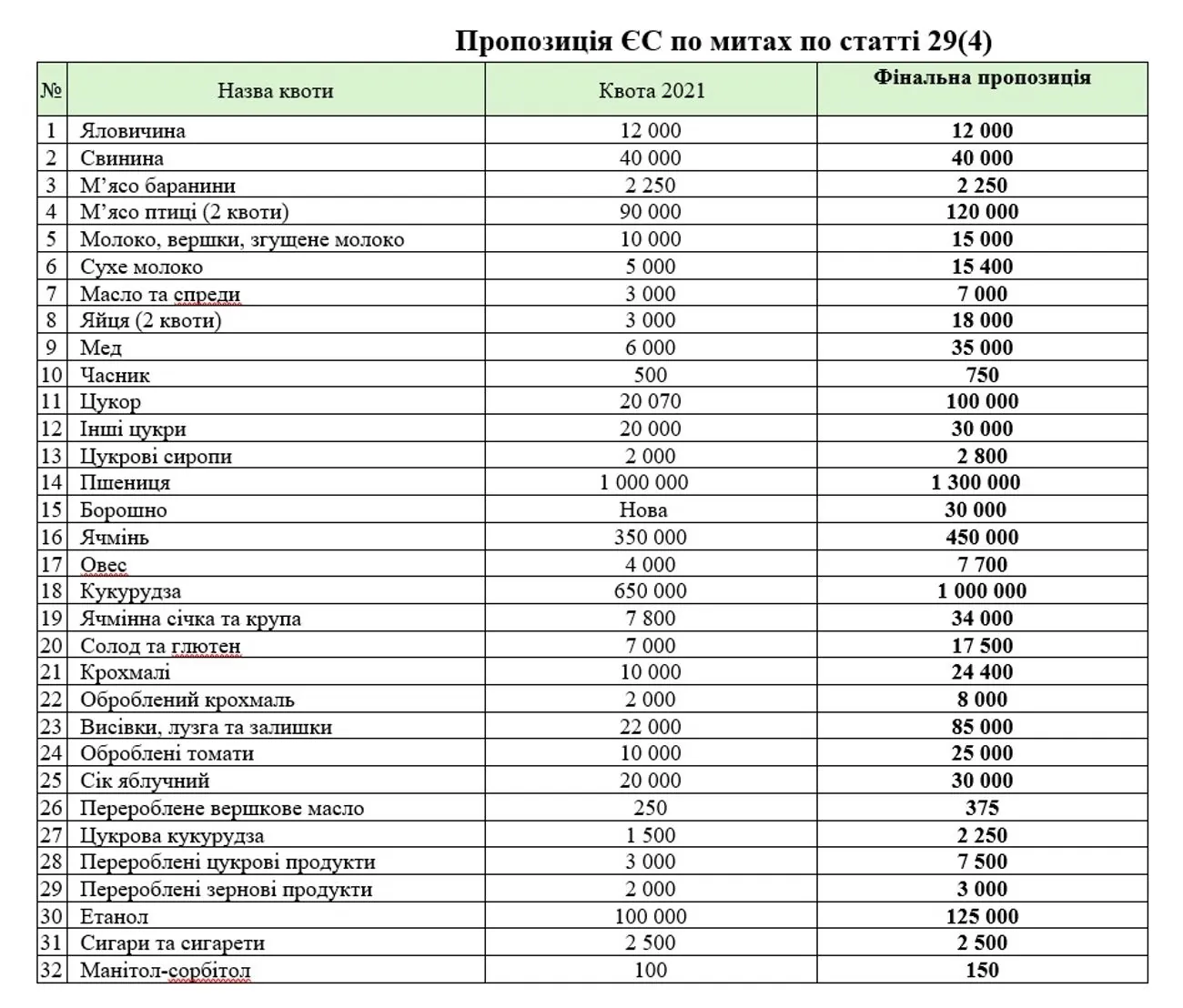 Квоту на мед збільшено у 5,8 разів, цукор в 5 разів, сухому молоці квоту збільшено у 3 рази, на яйця в 3 рази збільшено, на солод у 2,5 рази, оброблені томати 2,5 рази, на крохмаль 2,5, вершкове масло 2,3 рази у порівнянні з 2021 роком. В принципі ми все збільшили, навіть на м'ясо птиці на 1,3 рази. Єдині чотири квоти, які ми не чіпали взагалі, це три червоних м’яса – яловичина, свинина, баранина, тому що ми не експортуємо й сигари та сигарети