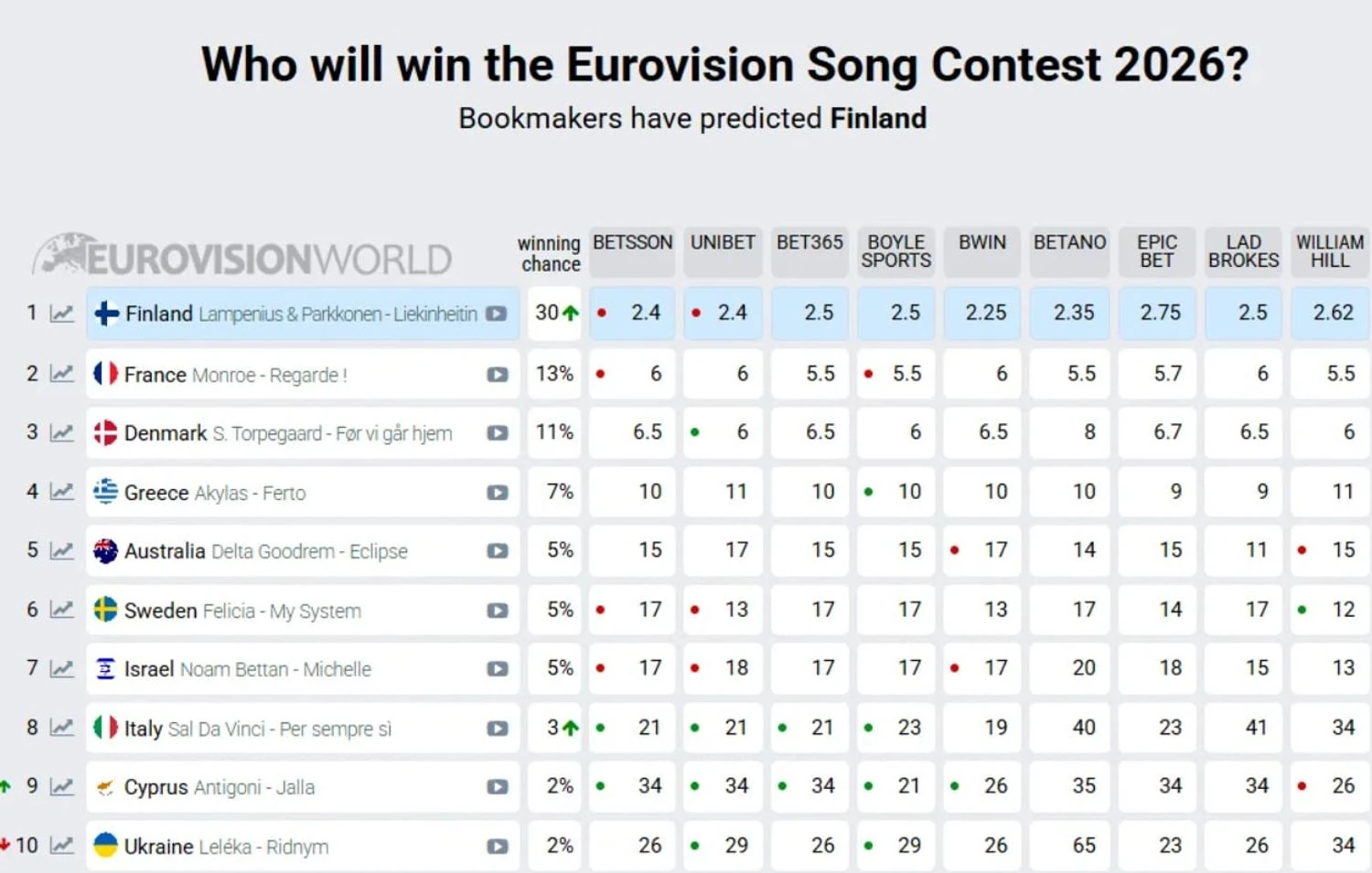На першому місці з величезним відривом утримує лідерство Фінляндія, чия конкурсна композиція вважається однією з найсильніших у цьому році. Музична майстерність виконавців Linda Lampenius та Pete Parkkonen, а також активна підтримка фанатів по всій Європі роблять фінський трек "Liekinheitin" беззаперечним претендентом на перемогу.