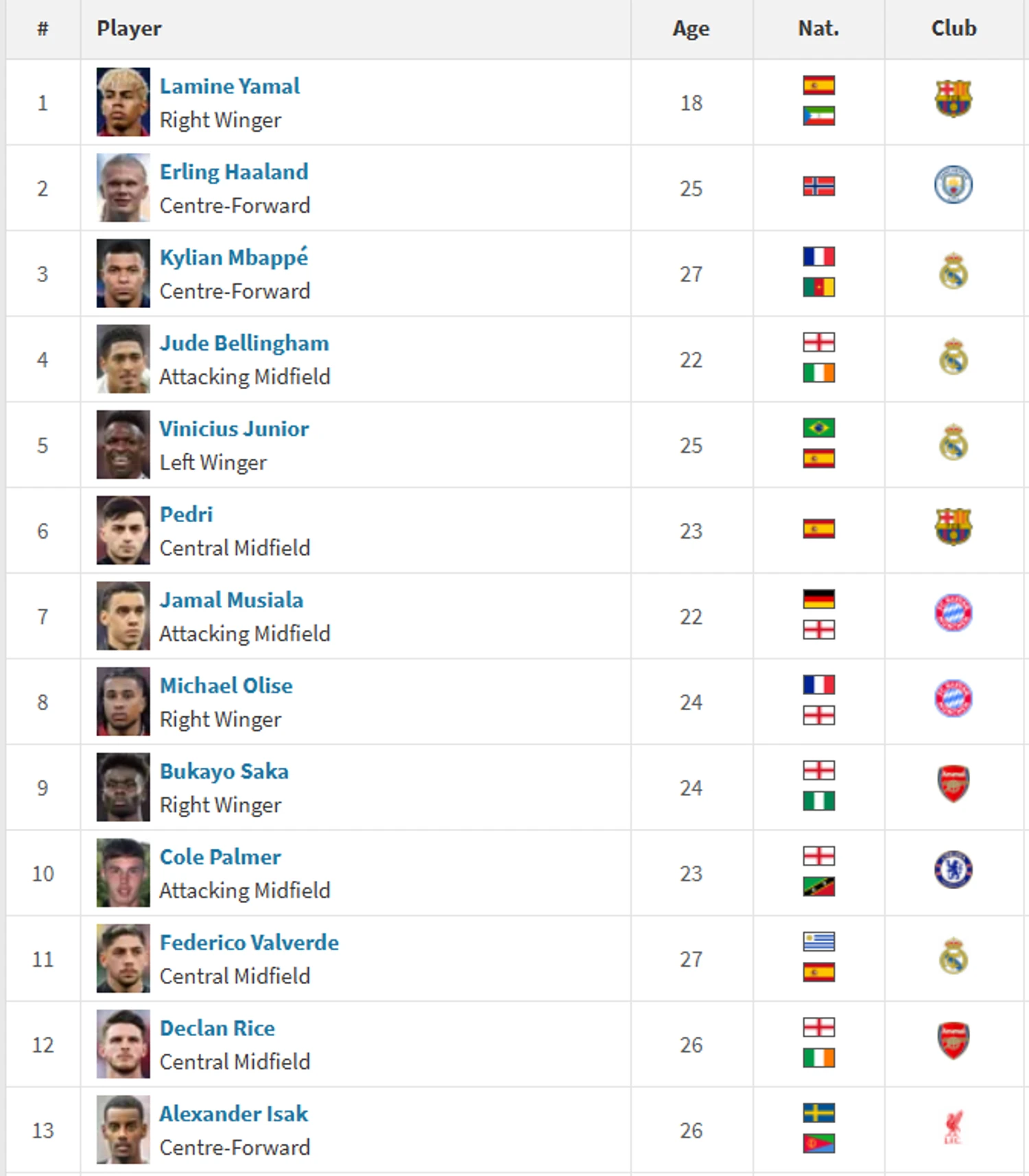 До топ-10 також увійшли Джуд Беллінгем ("Реал"), Вінісіус Жуніор ("Реал"), Педрі ("Барселона"), Джамал Мусіала ("Баварія"), Майкл Олісе ("Баварія"), Букайо Сака ("Арсенал"), Коул Палмер ("Челсі"), Федеріко Вальверде ("Реал"), Деклан Райс ("Арсенал") та Александер Ісак ("Ліверпуль").