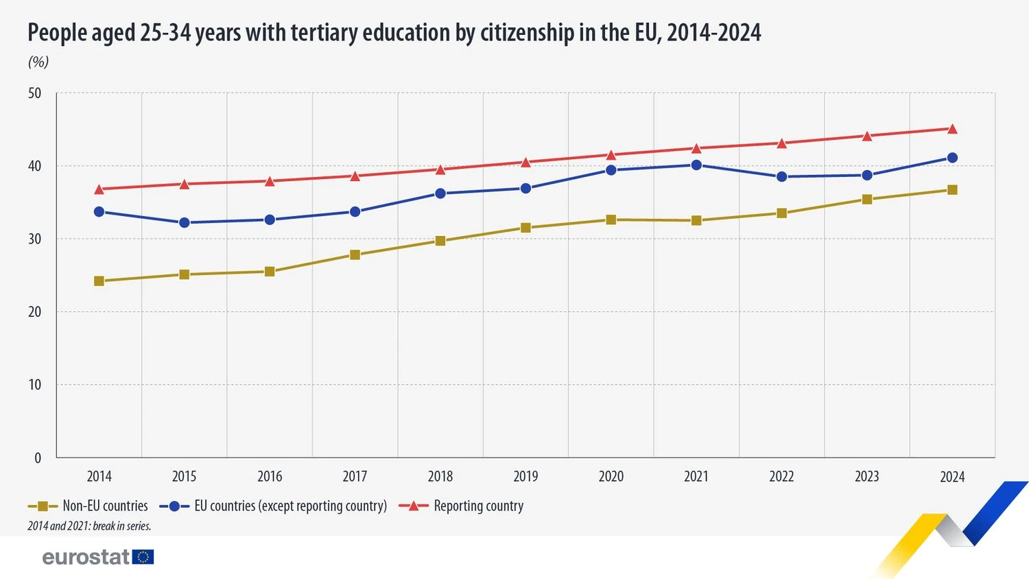 Громадяни країн поза ЄС (25–34 роки): 36,7% з вищою освітою у 2024 році (проти 24,2% у 2014-му).