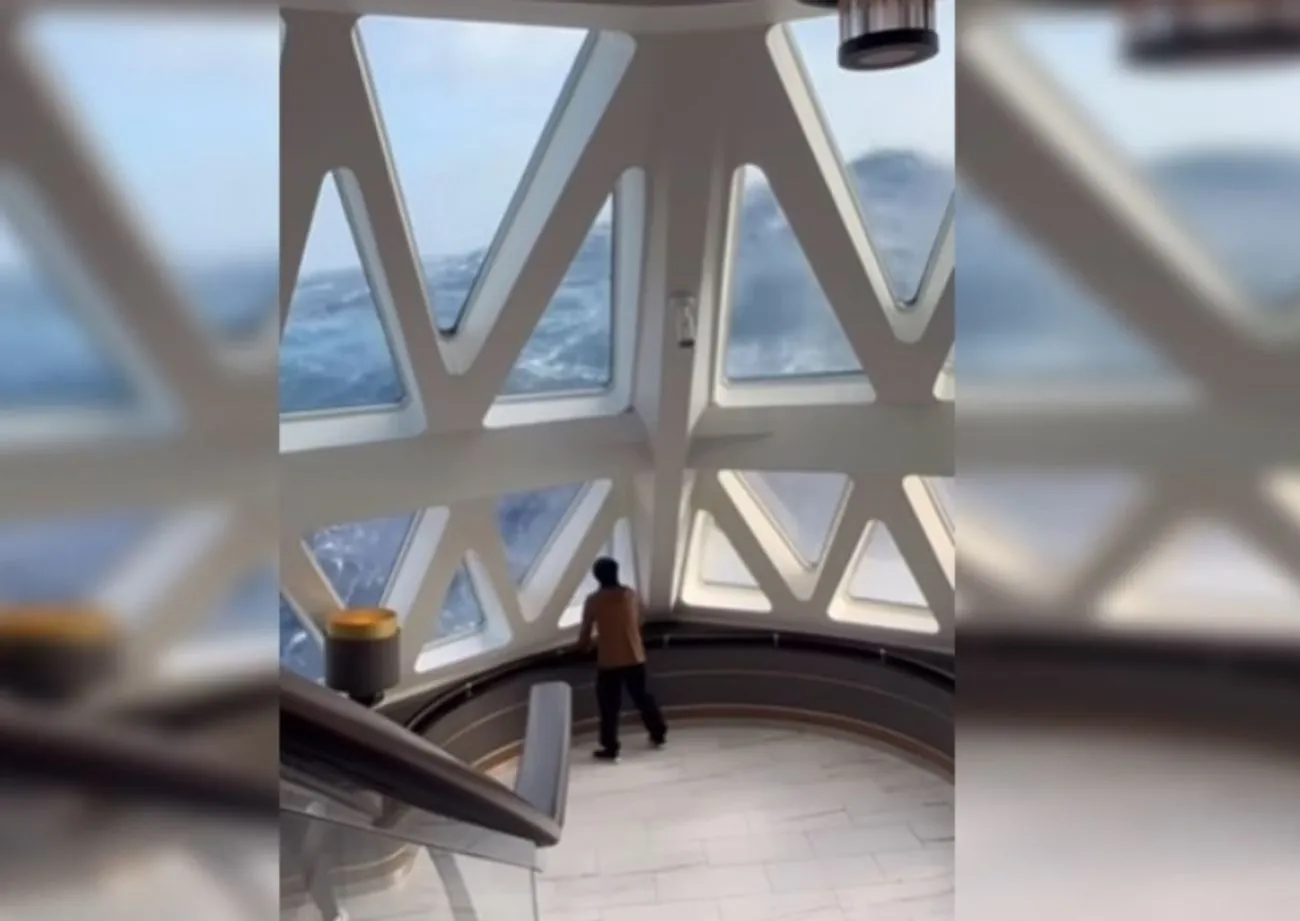 На відео видно, як гігантські хвилі розбиваються об панорамні вікна, а пасажири намагаються встояти на ногах.