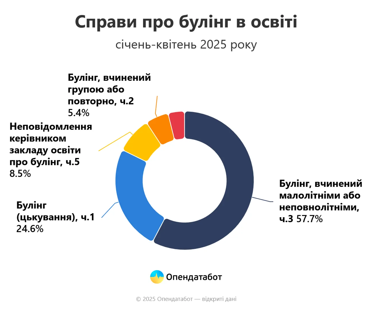 За даними Національної поліції України (НПУ), за перші чотири місяці 2025 року в Україні зафіксовано 130 випадків булінгу (будь-якої форми насильства або приниження одними учнями інших).