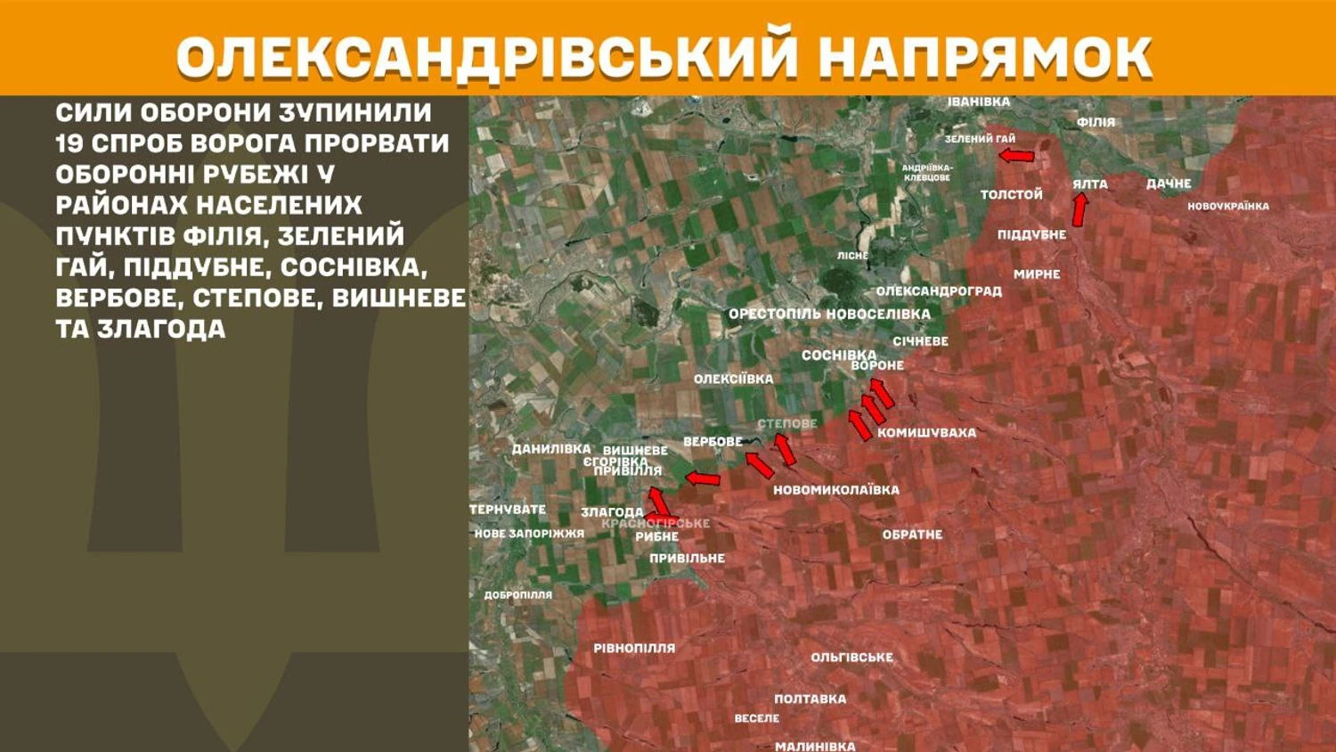 На Олександрівському напрямку Сили оборони зупинили 19 спроб ворога прорвати оборонні рубежі у районах населених пунктів Філія, Зелений Гай, Піддубне, Соснівка, Вербове, Степове, Вишневе та Злагода.