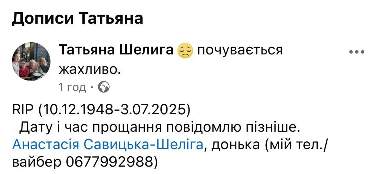 "RIP (10.12.1948- 3.07.2025). Дату і час прощання повідомлю пізніше", – написала жінка.