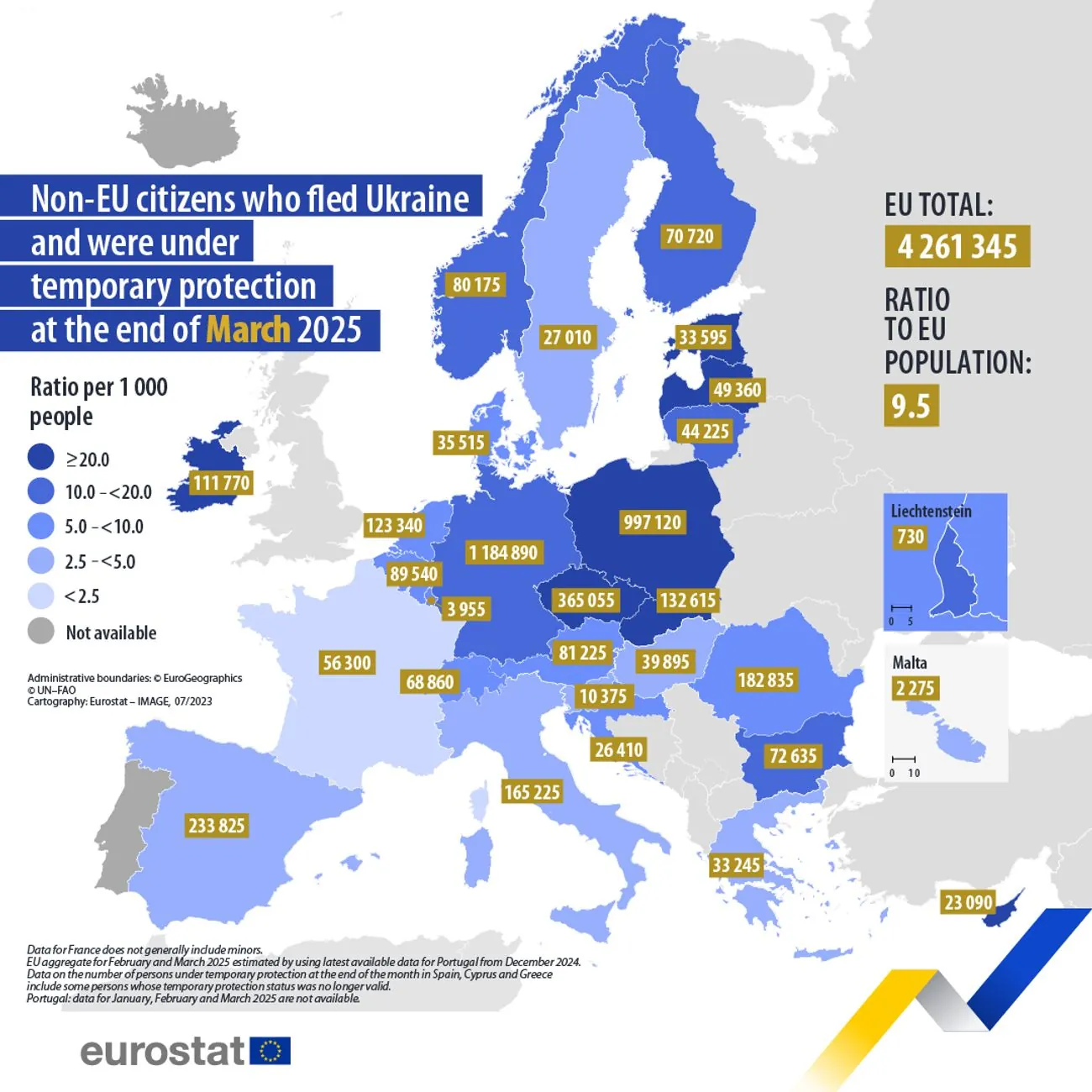 Станом на кінець березня 2025 року понад 4,26 млн українців отримали тимчасовий захист в ЄС. Найбільше біженців прийняли Німеччина, Польща та Чехія.