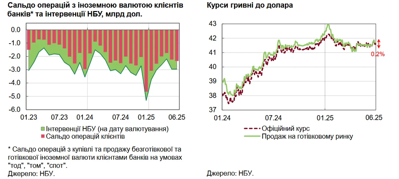 У червні попит на валюту залишався близьким до рівня попереднього місяця, а курсові коливання - помірними, при цьому курс гривні до євро послаблювався через динаміку валютної пари EUR/USD, ідеться у макроекономічному та монетарному огляді НБУ за липень 2025 року, пише УНН.