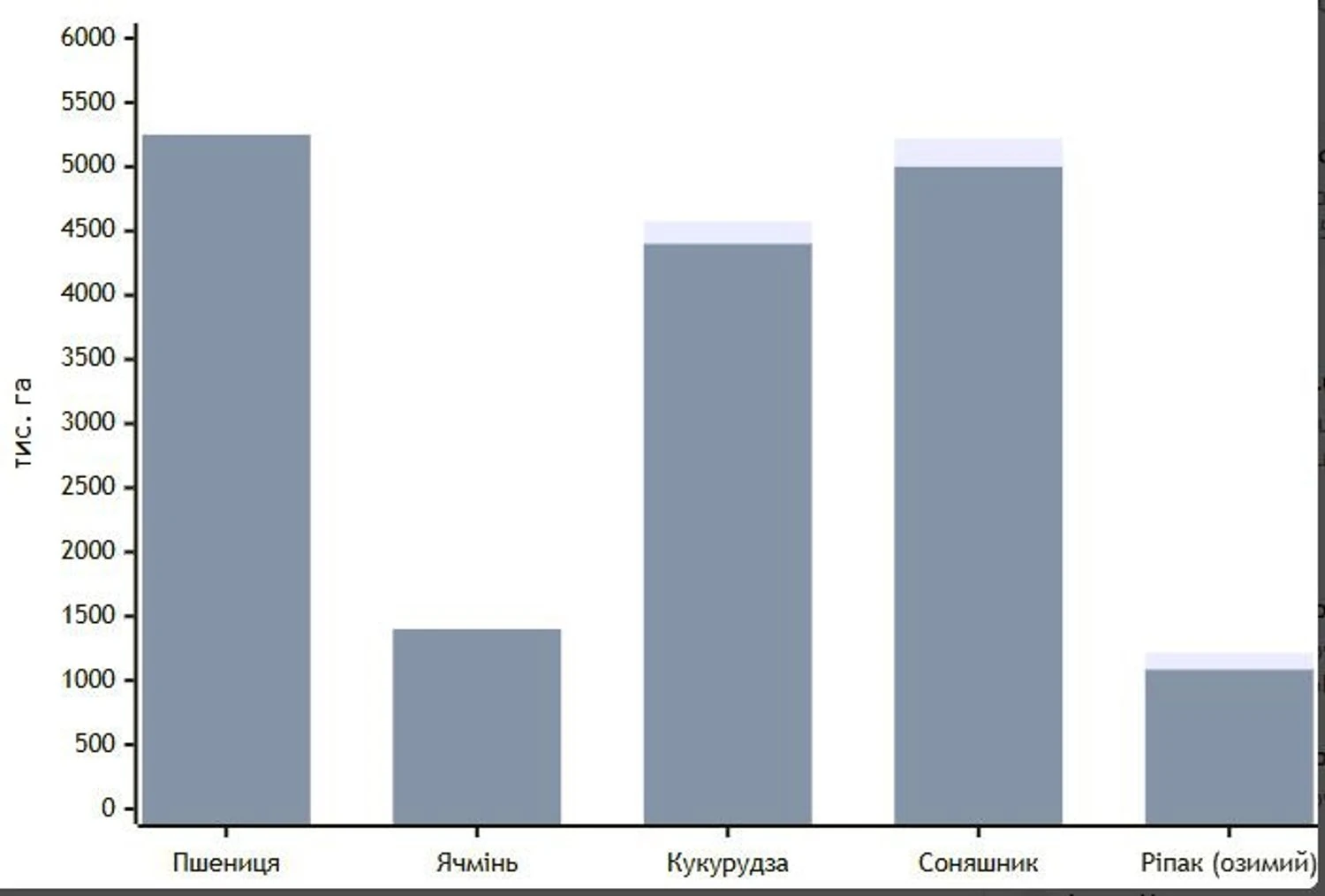 Площі під пшеницею у 2026 році оцінюються в 5 250,0 тис. га, що на 36,6 тис. га більше, ніж у 2025-му (+0,7%). Ячмінь також додає: 1 400,0 тис. га проти 1 390,4 тис. га торік (плюс 9,6 тис. га, +0,7%).