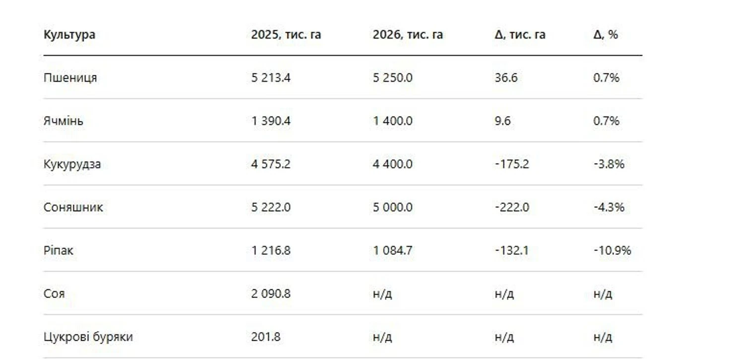 На цьому фоні кукурудза скорочується до 4 400,0 тис. га з 4 575,2 тис. га у 2025 році (мінус 175,2 тис. га, -3,8%).