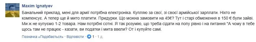 "Банальний приклад, мені для армії потрібна електроніка. Купляю за свої, зі своєї армійської зарплати. Ніхто не компенсує. А тепер ще й мито платити. Придурки. Що можна замовити на 45€? Тут і старі обмеження в 150 € були зайві. Ми ж не купуємо 1-2 товара. Нам потрібні сотні. Я так розумію, що треба сідати на попу рівно і на питання "А чому в тебе щось там не працює - казати, ви податки і мита ввели? От і купуйте самі".