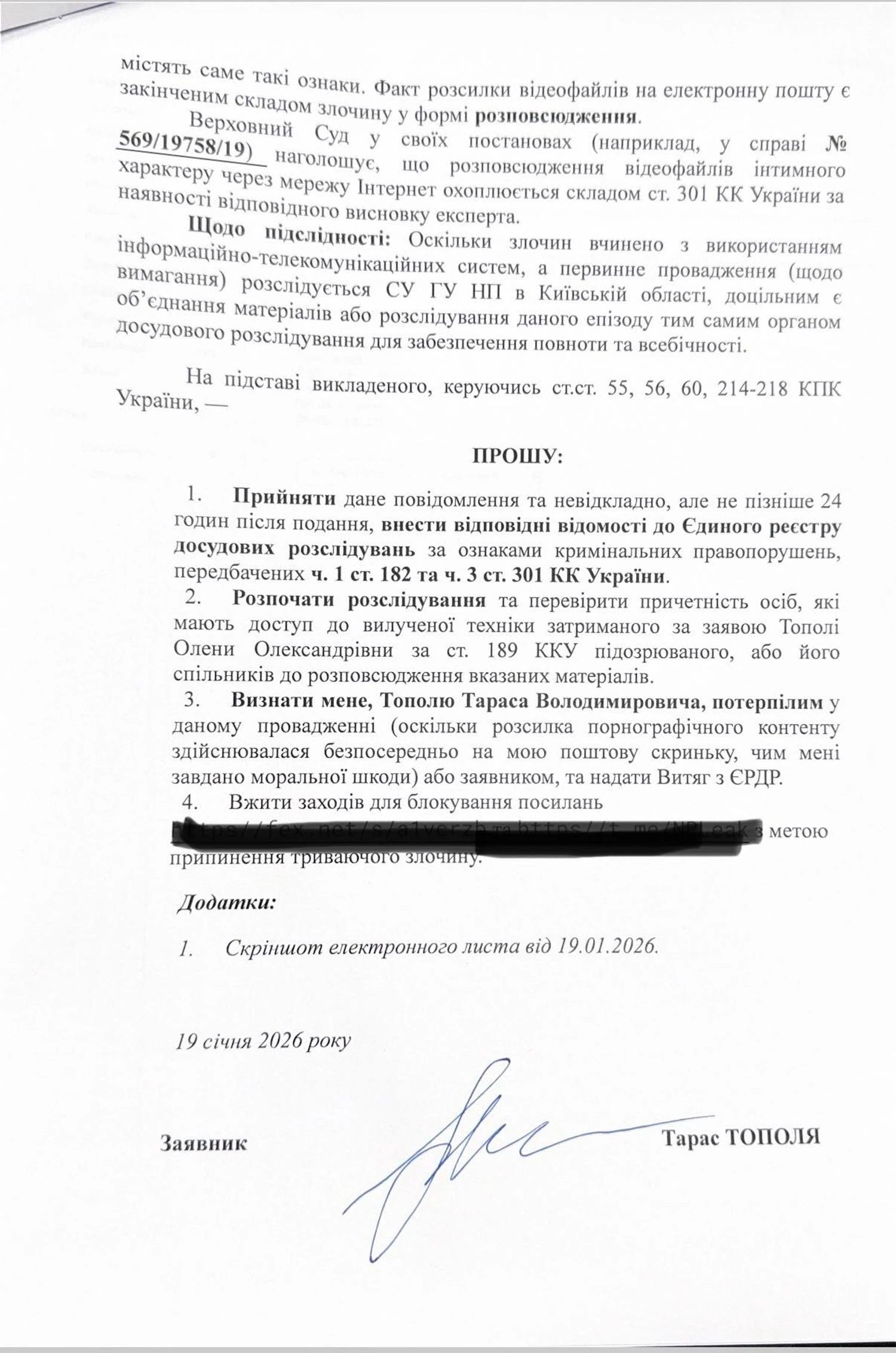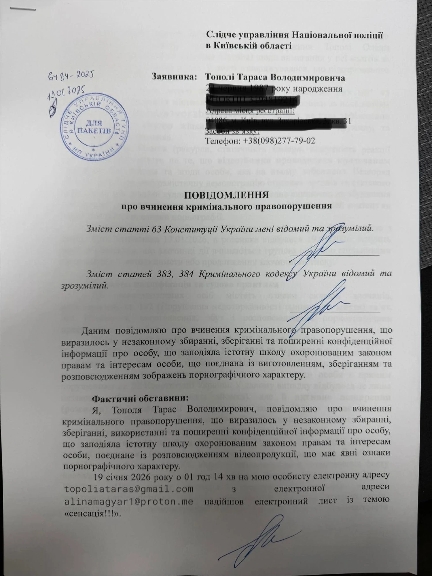 Тарас Тополя подав заяву в поліцію через розповсюдження приватних матеріалів ексдружини Alyosha. Він закликав не поширювати ці відео та висловив припущення, що за цим стоїть особа, яка роками стежила за їхньою родиною.
