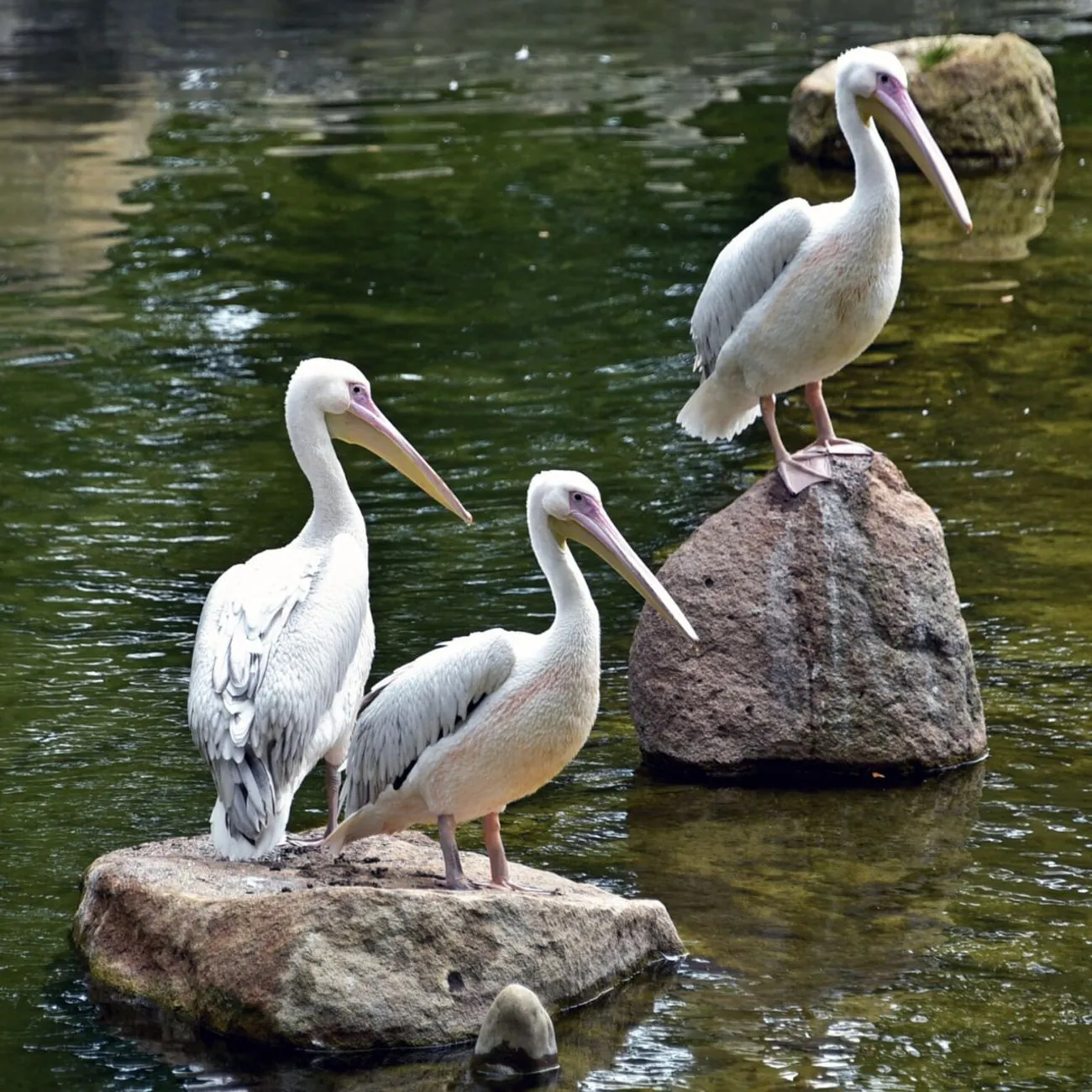 У звіринці живе 4 кучеряві та 16 рожевих пеліканів. Того року ця зграя поповнилась ще й трьома пташенятами. Їхнє комфортне життя забезпечують чиста вода, природне каміння, засіяні травичкою схили, густі кущі та високі дерева, зони для прийняття сонячних ванн та гніздові платформи.