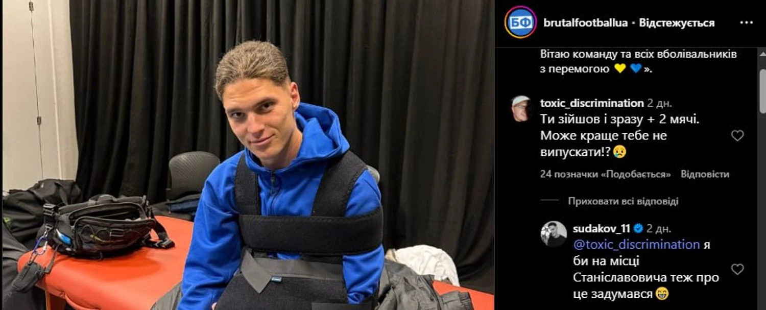 У суботу Судаков у своєму Telegram-каналі опублікував фото після травми, на що швидко відреагували фанати та футбольні пабліки. В одному із постів, фанат пожартував: "Ти зійшов і зразу + 2 м'ячі. Може краще тебе не випускати!?", на що Судаков відповів: "Я би на місці Станіславовича теж про це задумався".