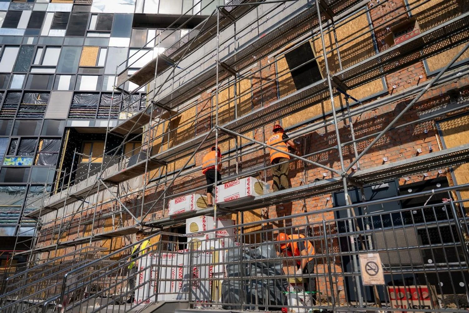 Демонтовано понад 2 200 м² пошкодженого покриття в блоках Д, В і Б, змонтовано кронштейни на площі понад 1 200 м². Також продовжуються роботи з утеплення фасаду. Завершується виготовлення нових вікон — їх встановлення розпочнеться вже з наступного тижня в окремих блоках.