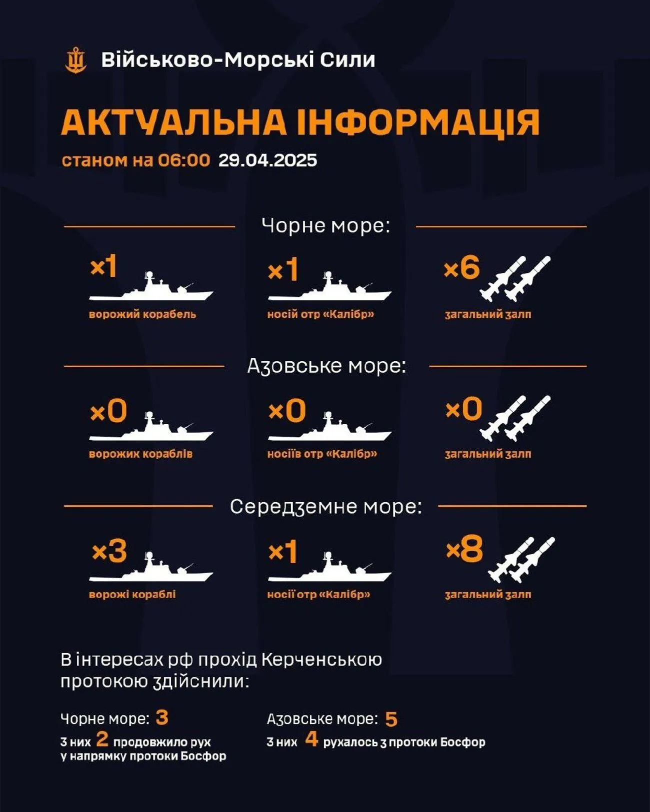 Зазначається, що станом на 06:00 29.04.2025 в Чорному морі зафіксовано 1 ворожий корабель, який є носієм крилатих ракет "Калібр" загальним залпом до 6 ракет.
