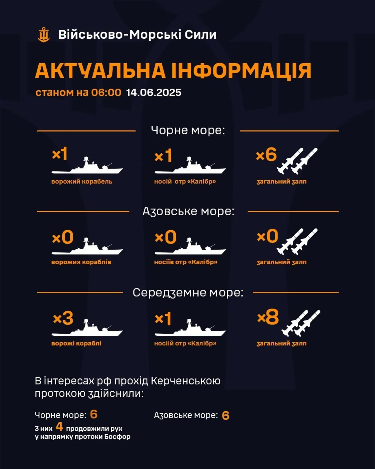 Водночас зазначається, що станом на 06:00 14.06.2025 в Азовському морі ворожі кораблі відсутні. При цьому в Середземному морі перебувають 3 кораблі рф, з яких 1 є носієм крилатих ракет "Калібр" загальним залпом до 8 ракет.