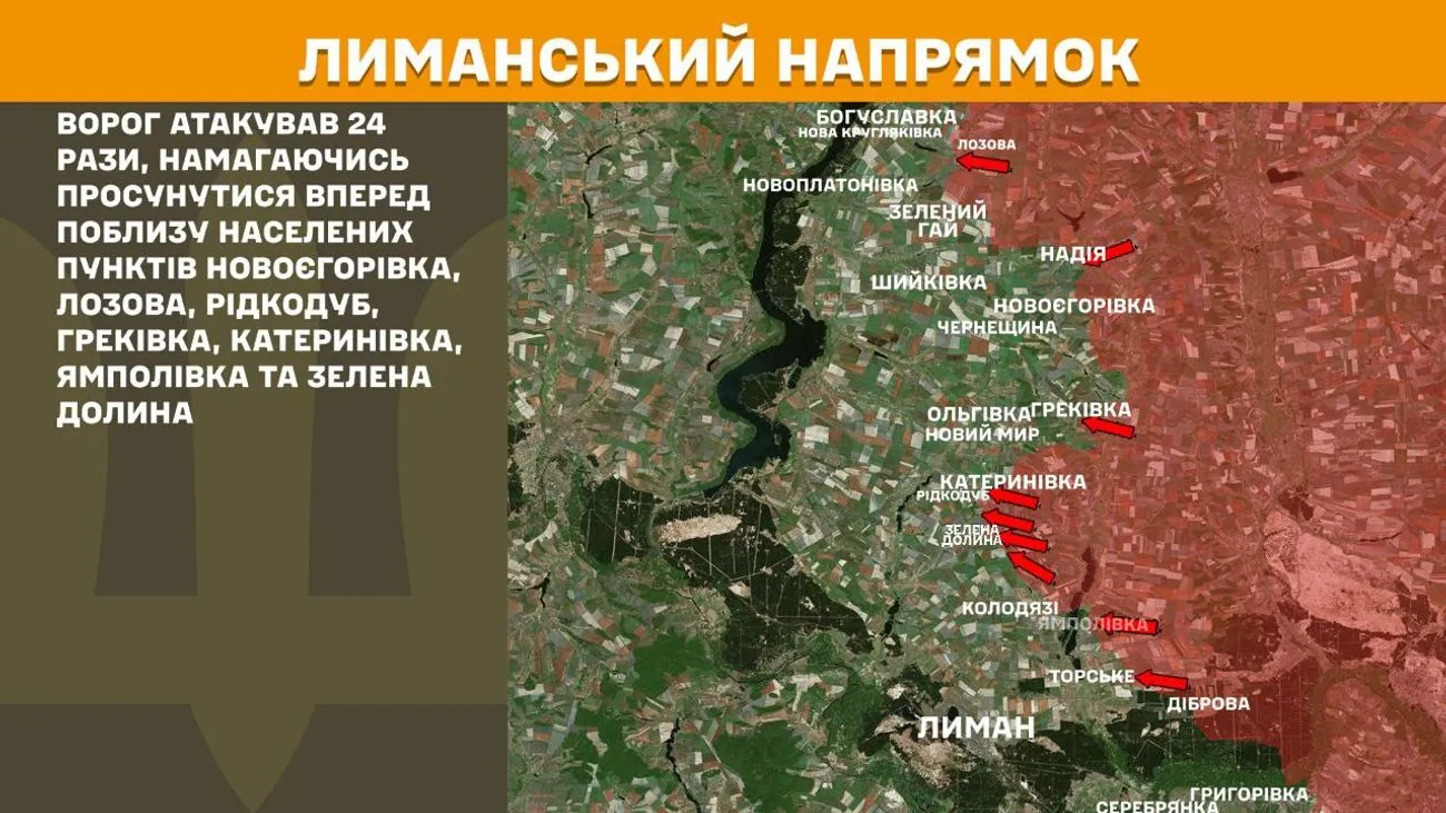 На Лиманському напрямку ворог атакував 24 рази, намагаючись просунутися вперед поблизу населених пунктів Новоєгорівка, Лозова, Рідкодуб, Греківка, Катеринівка, Ямполівка та Зелена Долина.