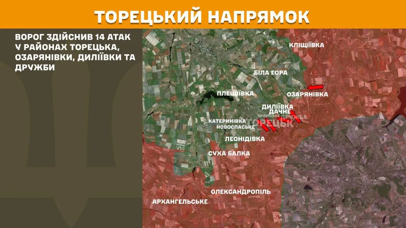 На Торецькому напрямку ворог здійснив 14 атак у районах Торецька, Озарянівки, Диліївки та Дружби.